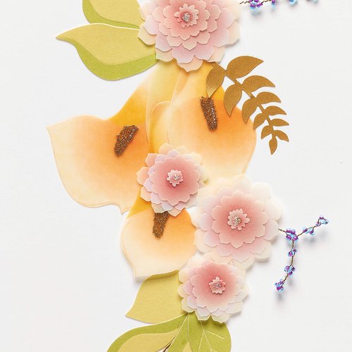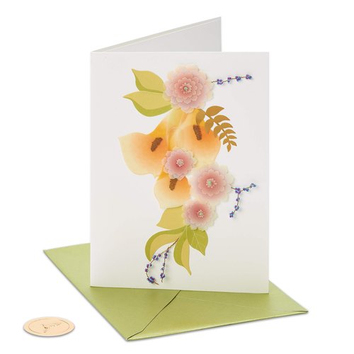 Details: Gorgeous vellum sculpted calla lily in a striking arrangement of flowers and foliage adds elegance to this birthday card from Papyrus. Handmade design is embellished with two-toned mini beads on wire, shimmering micro-beads, gold foil and glitter accents. Unique 5 x 7" design is finished with an insert sheet with gold foil greeting. Comes with a coordinating green pearl envelope with green pearl liner, gold Papyrus hummingbird seal and a protective cello sleeve.