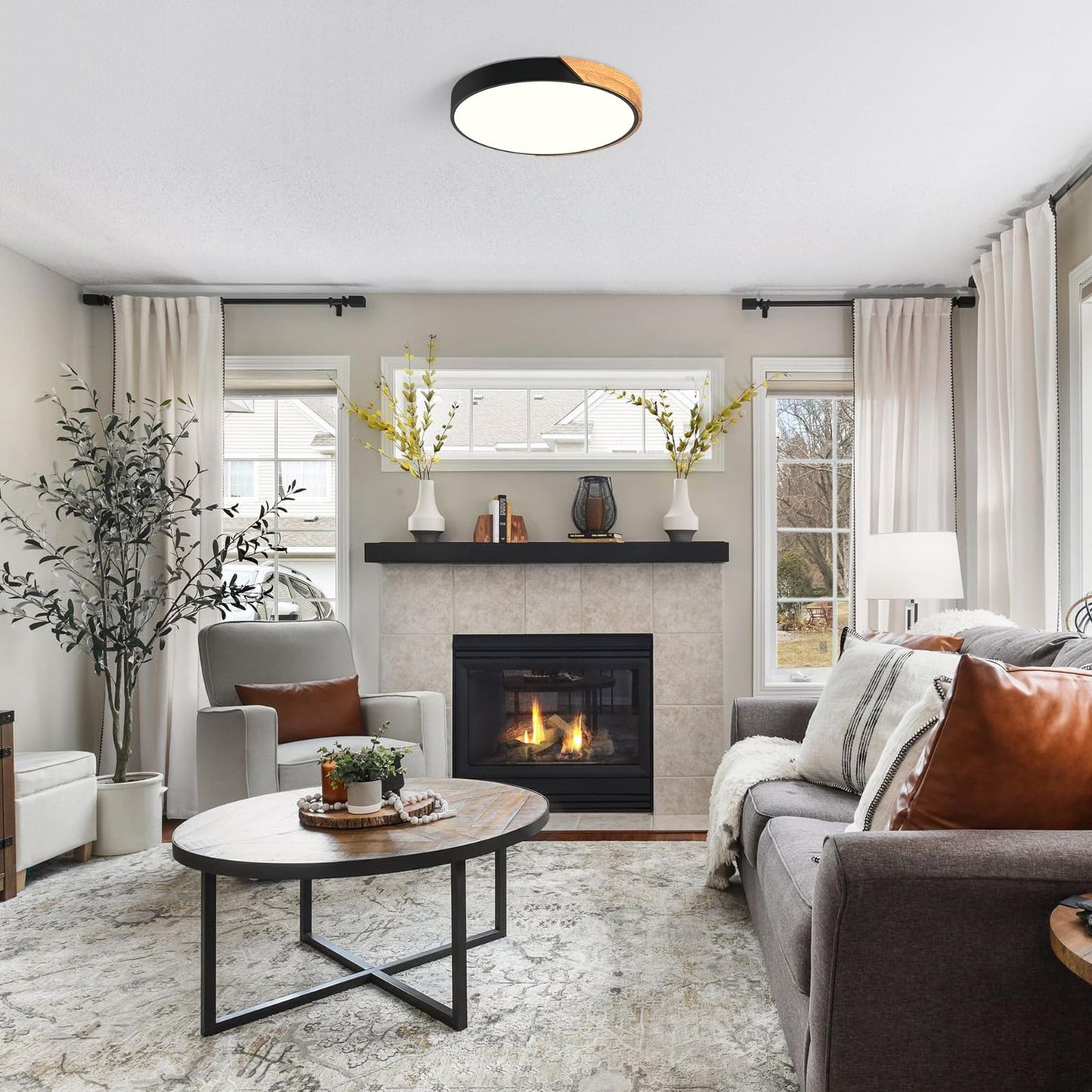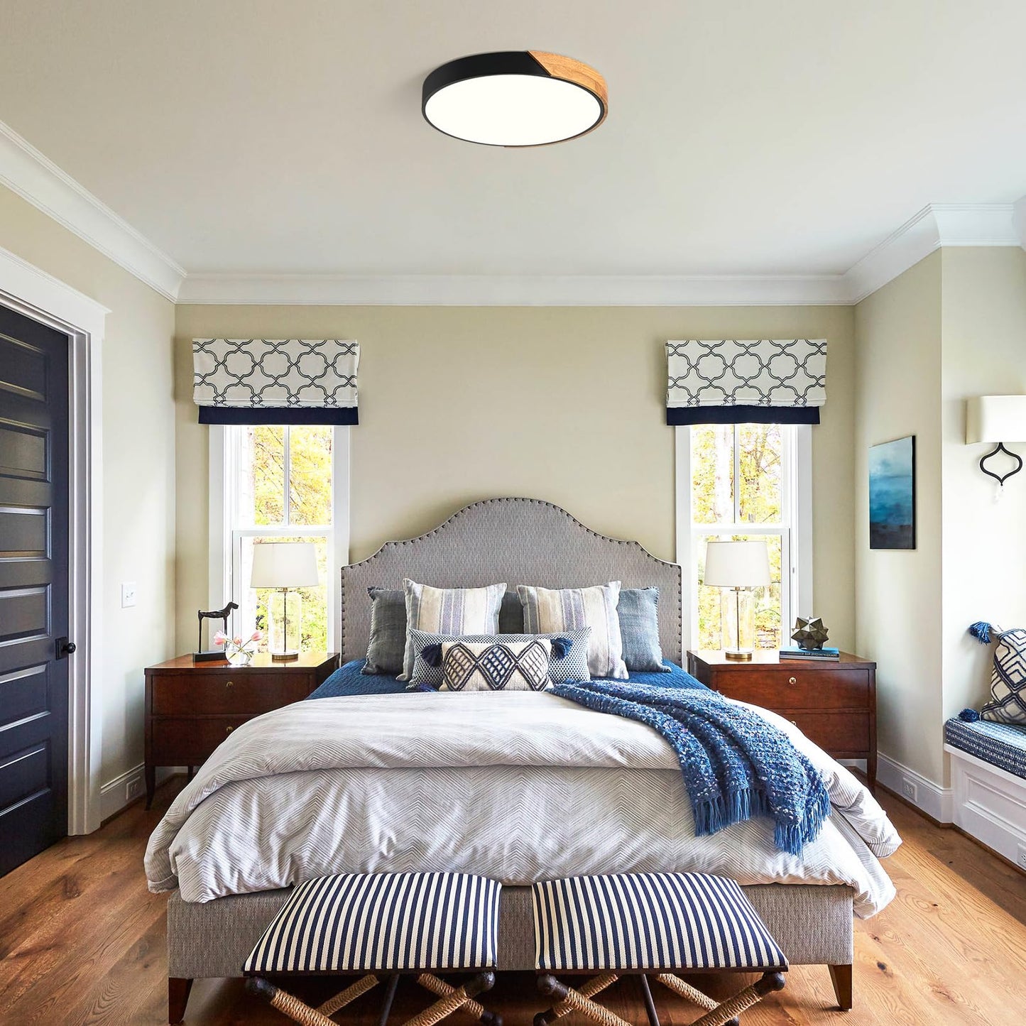 Peblto Modern Dimmable Black LED Ceiling Light, 2700 K - 6000 K 5CCT Wood Flush Mount Ceiling Lighting Fixtures, Minimalist Round Ceiling Lamp for Living Room Bedroom Kitchen Hallway