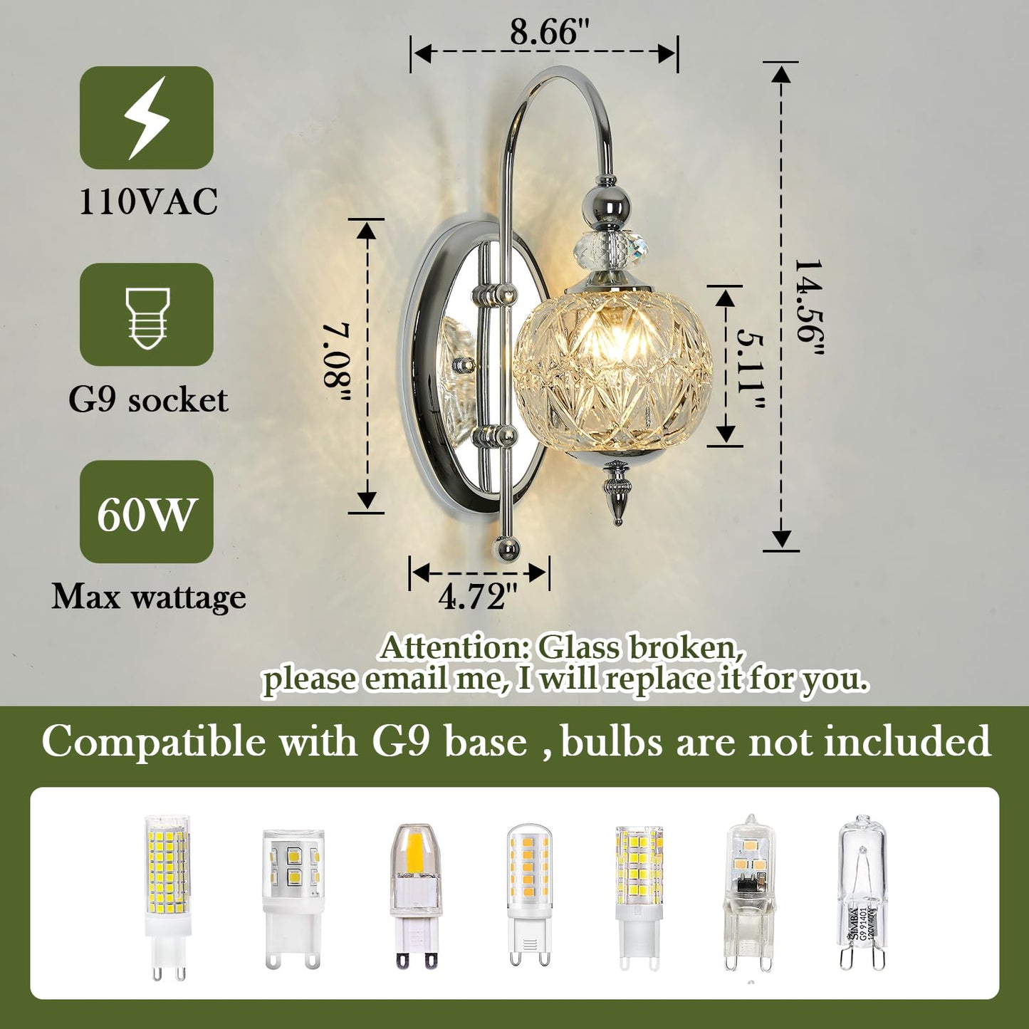 - Ideal Dimensions: Needs 1 G9 bulbs (Bulb not Included) Fixture total diameter 8.66", 14.56" high,The glass lamp shade 5.11"diameter,and the ceiling panel is 7.08"in diameter.Attention: Please note the size. The glass is broken, please email me and I will replace it for you.