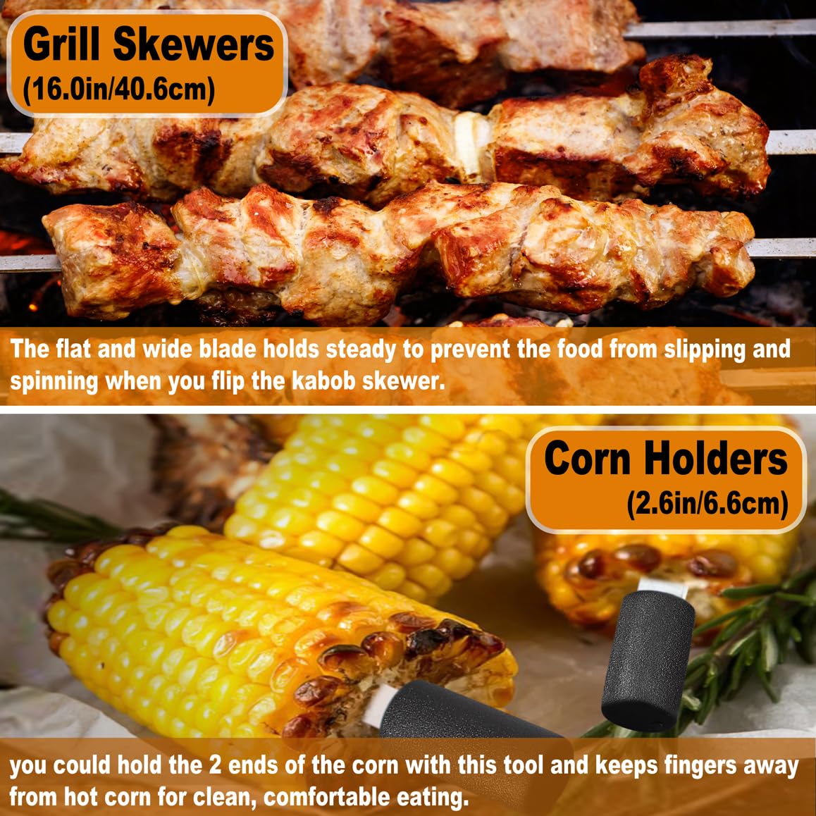 - Complete and Practical grill utensils set - This all-inclusive BBQ set provides you with all grilling accessories necessary and leaves nothing to be desired. The grill set including spatula, tongs, fork, thermometer, knife, cleaning brush&extra head, basting brush, injector, skewers, meat claws, pepper shakers, corn holders and aluminum storage case is here to not only meet, but exceed your expectation.