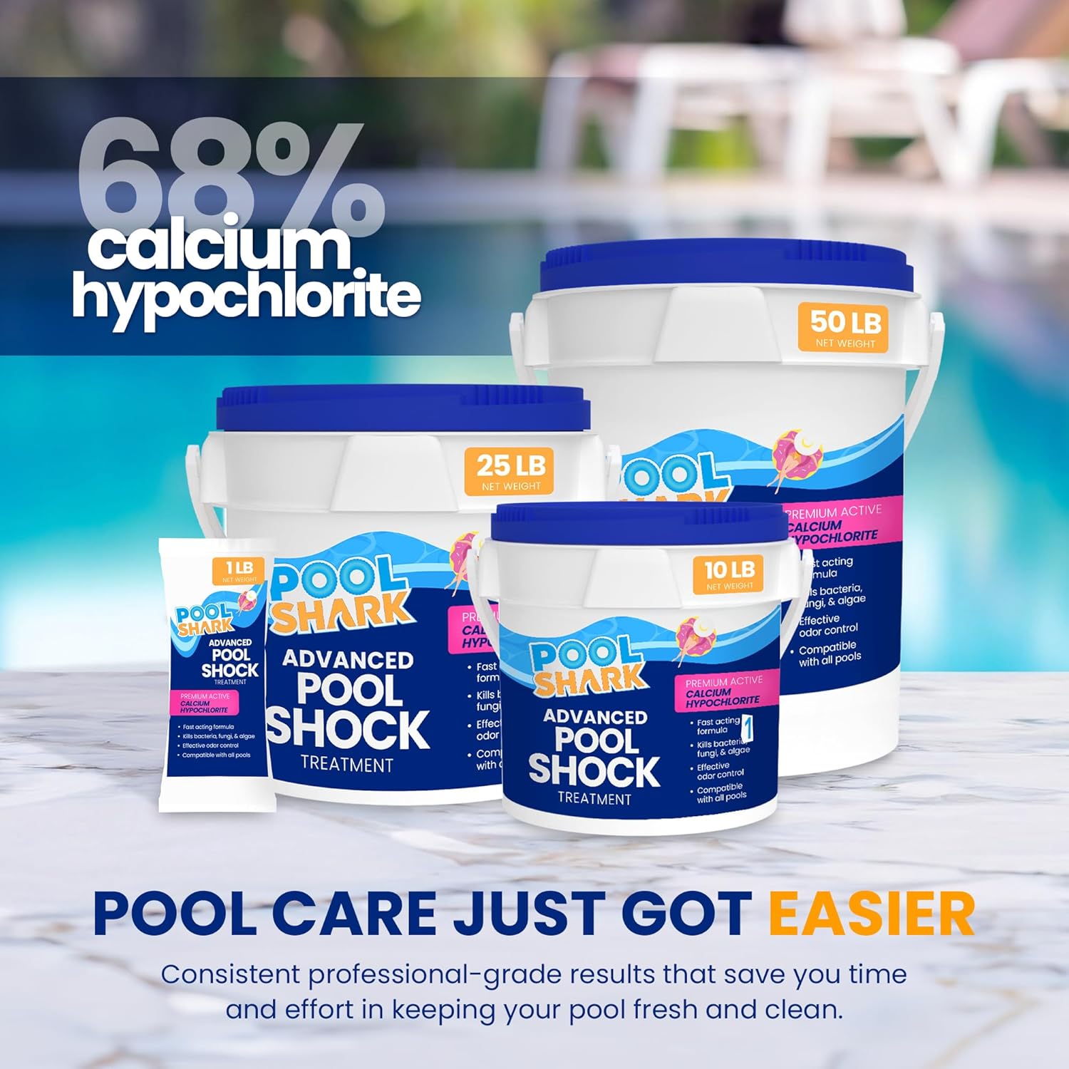 - POWERFUL CALCIUM HYPOCHLORITE FORMULA – Contains 68% active chlorine from Calcium Hypochlorite. This high-strength pool shock kills algae, bacteria, and fungi fast, keeping your pool water safe and clean for swimmers.