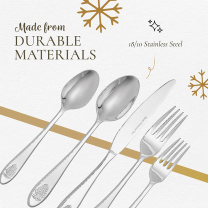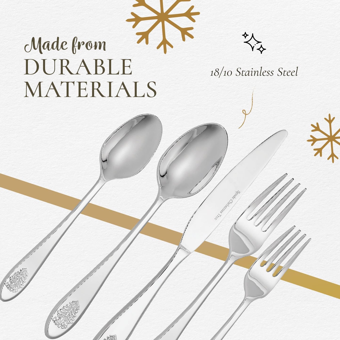 - Durable Stainless Steel: Each piece in this flatware set is made from 18/10 stainless steel, ensuring lasting durability. The handles feature a finely embossed Christmas Tree motif, adding a decorative touch that enhances your holiday table.