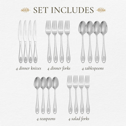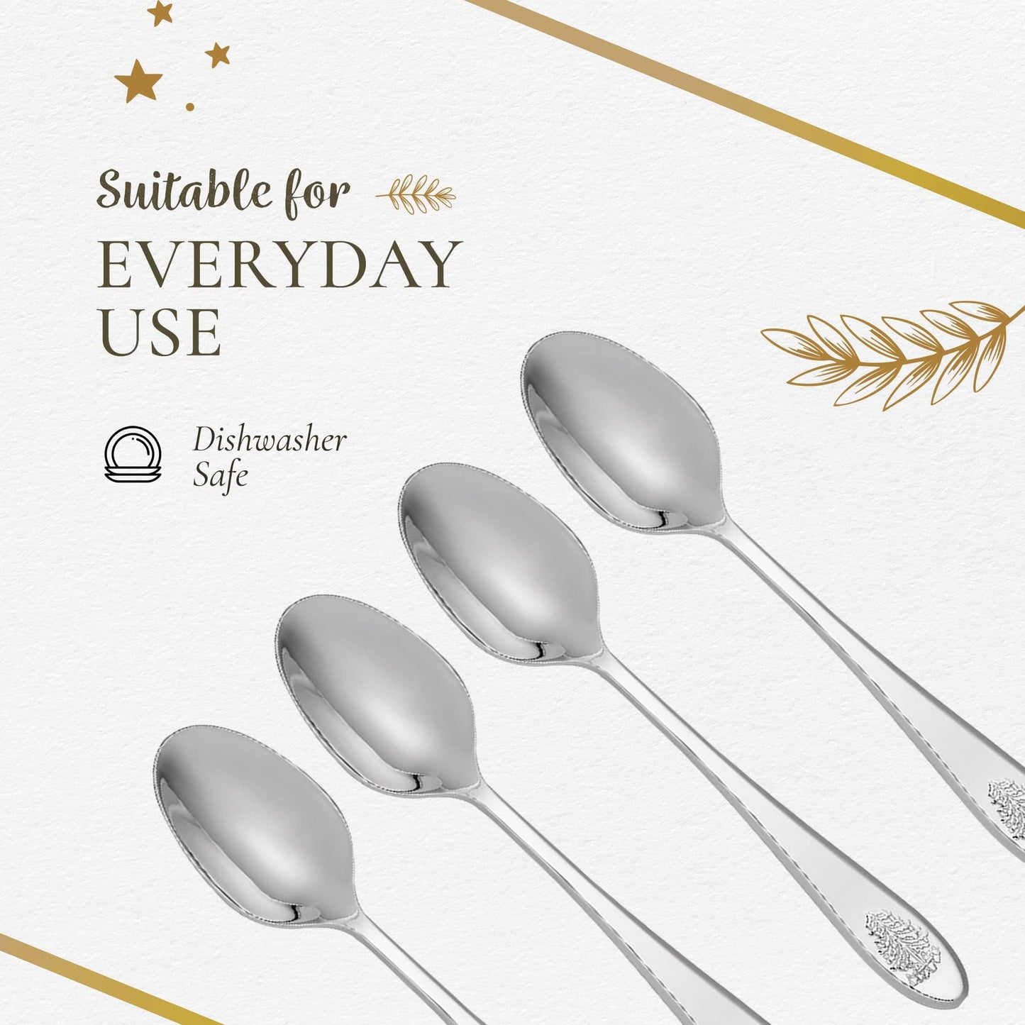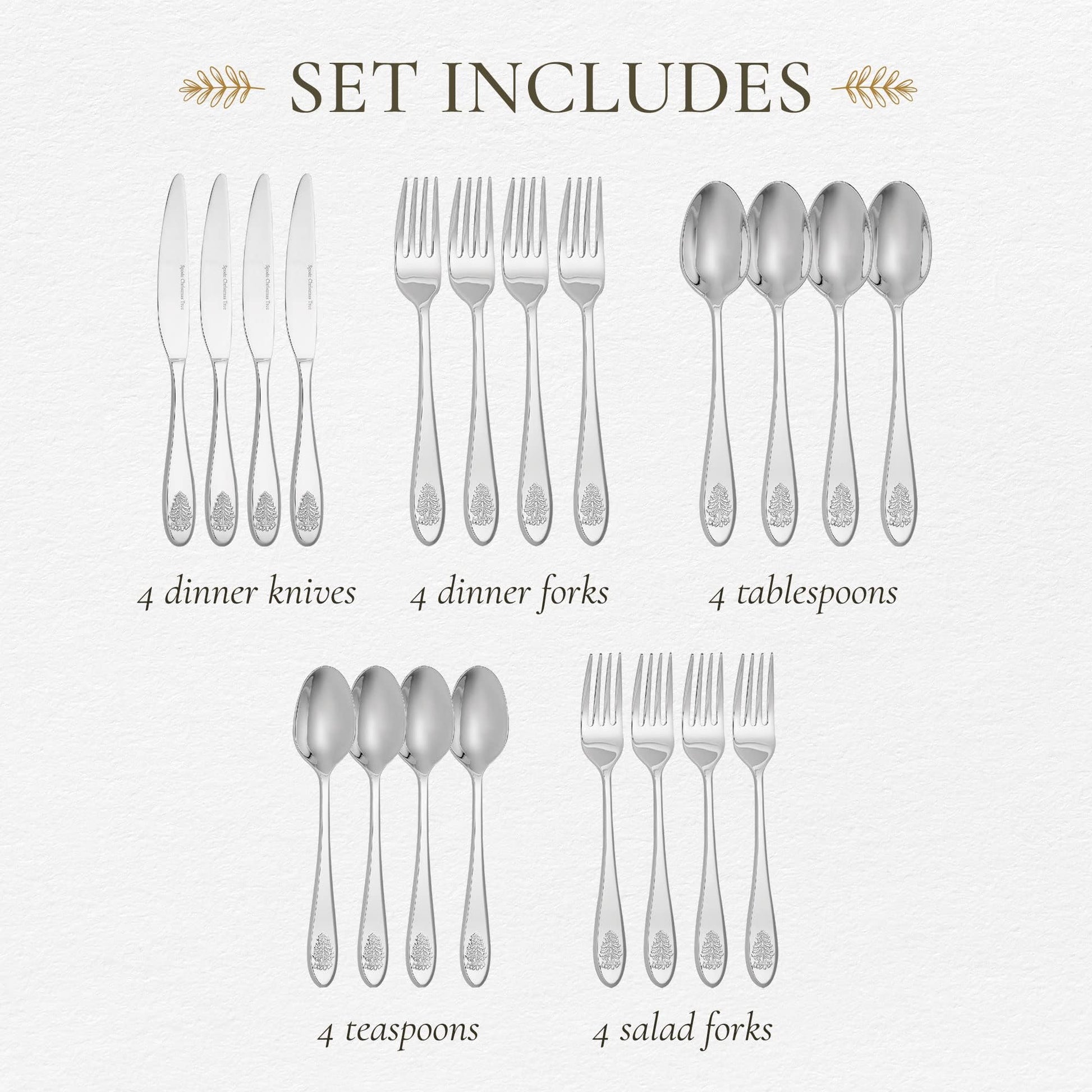 - Complete 20-Piece Flatware Set: This set includes 4 Dinner Forks, 4 Salad Forks, 4 Dinner Knives, 4 Tablespoons, and 4 Teaspoons, offering a full complement of cutlery for your dining table that is ideal for both holiday feasts and everyday use.
