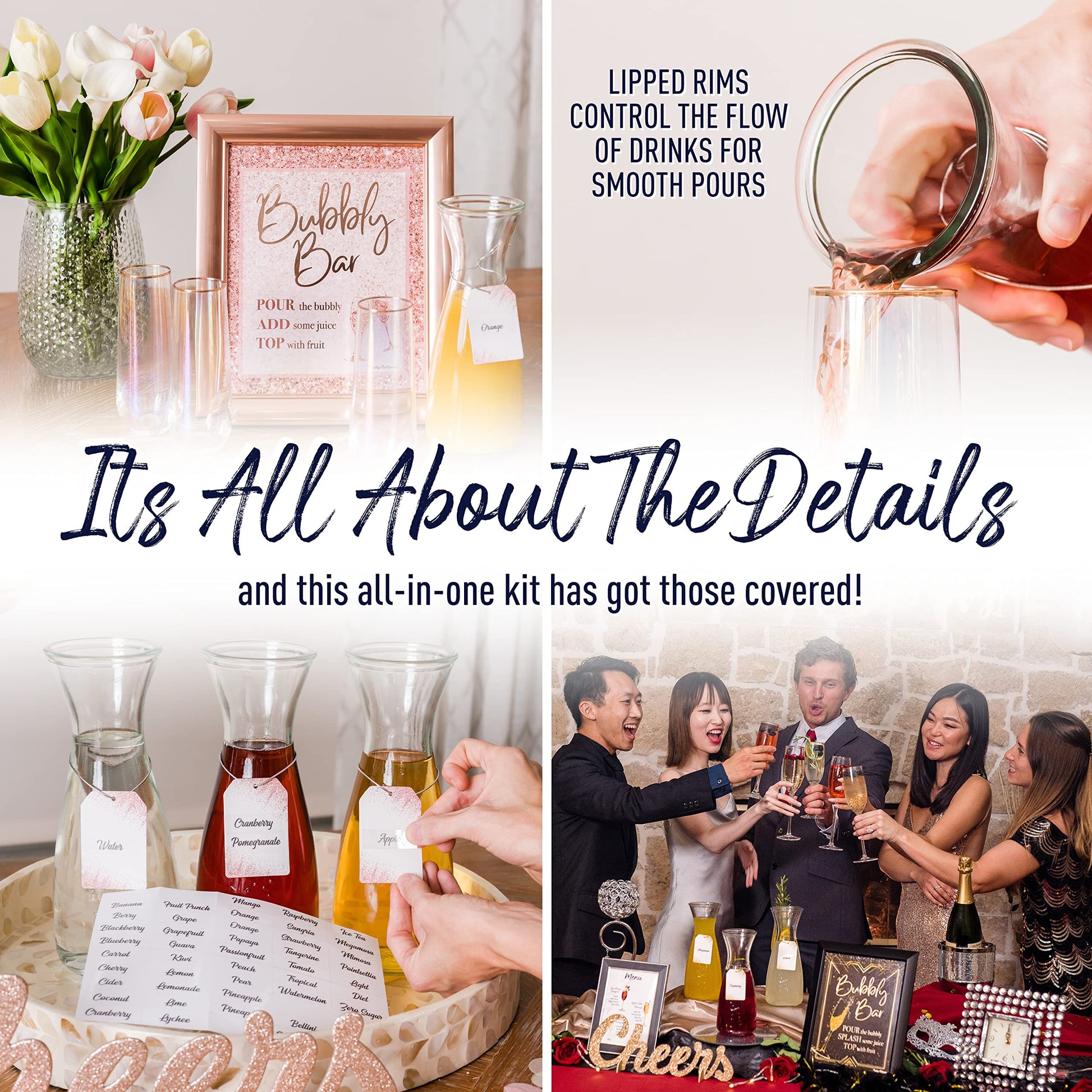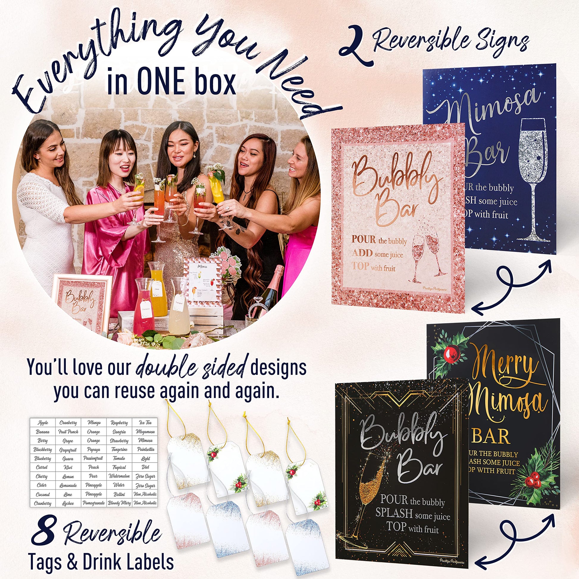 - COMPLETE PARTY SERVING SUPPLIES SET – On a search for the perfect champagne birthday decorations, Mother’s Day brunch decorations for women, bachelorette party decorations, Nashville bachelorette party decorations, or rose gold party decorations? Our New Year’s Eve party supplies consist of 3 mimosa juice bottle set with watertight lids, 2 reversible 8”x10” champagne wall bar signs, 8 reversible tags with ribbon, and 50 juice labels – Best bachelorette decorations! (8”x10” frame NOT included)