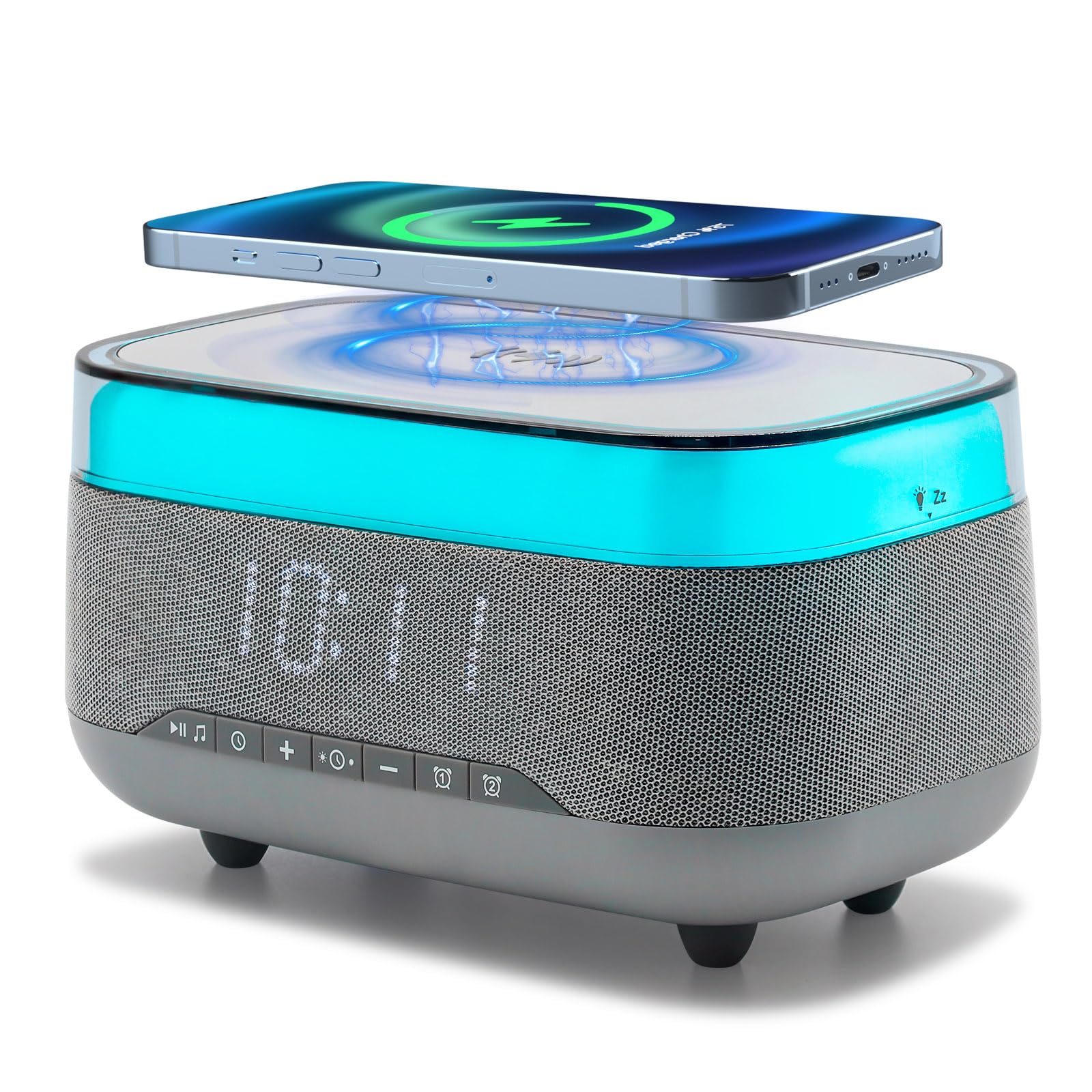 - Multifunctional Design: The Pribuy alarm clock streamlines your space with a wireless charger, Bluetooth speaker, Digital clock and colorful night light. Stylish & convenient for desk or bedside