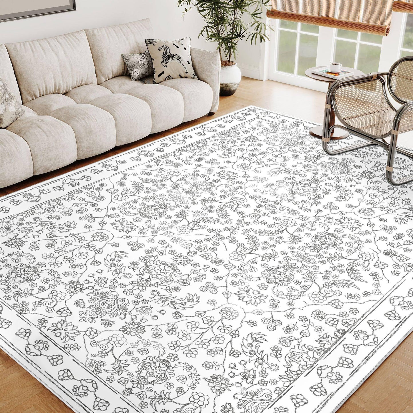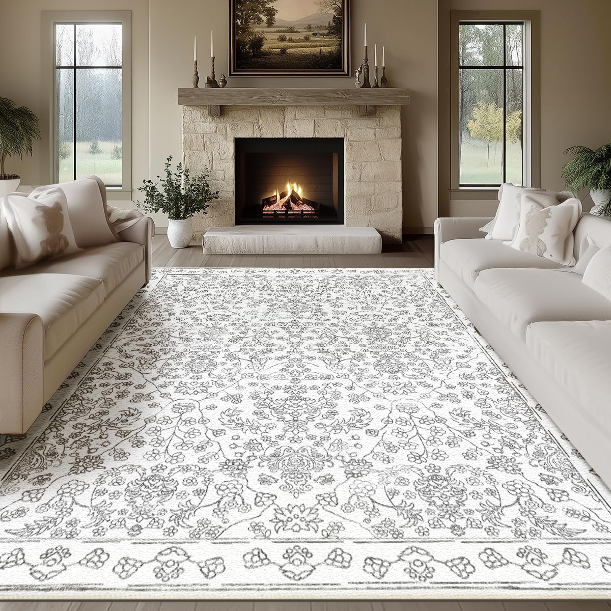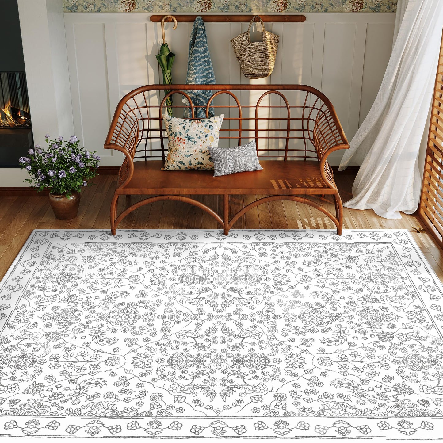 PureCozy Floral Area Rug 6x9 Washable Grey Carpet Non Slip Large Boho Thin Farmhouse Throw Accent Rug for Living Room Bedroom Office Kitchen Bathroom