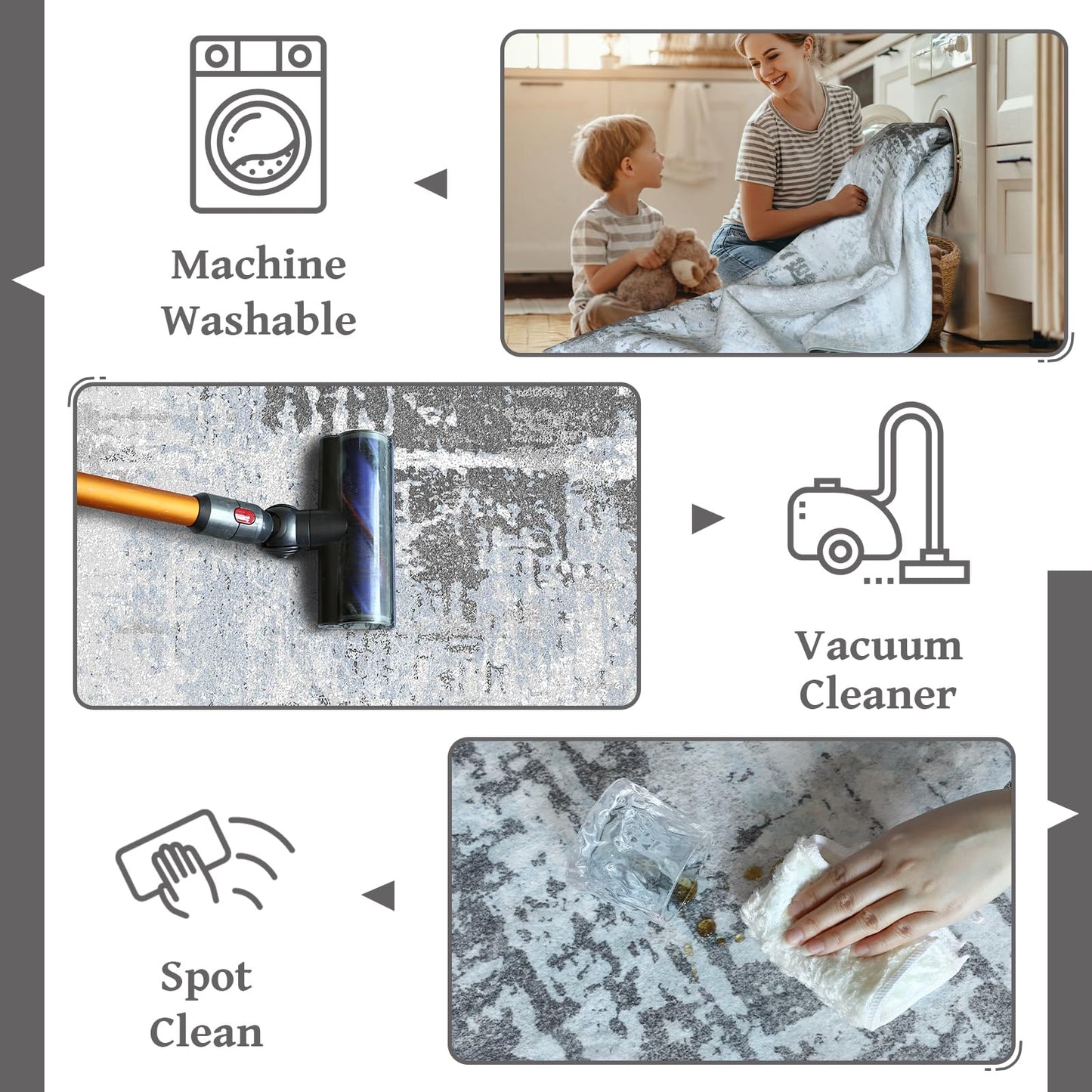 - Machine Washable Area Rug & Easy Care: Lint-free, it won't trap dirt, small dust and dirt on the surface can be wiped with a rag, broom, vacuum or robot vacuum cleaner. Of course, you can also wash it thoroughly in the washing machine for a deep cleaning. Take it out and look brand new. But it is best to use cold water and never use bleach. Innovative one-piece machine washable rugs makes your home cleaning easier.