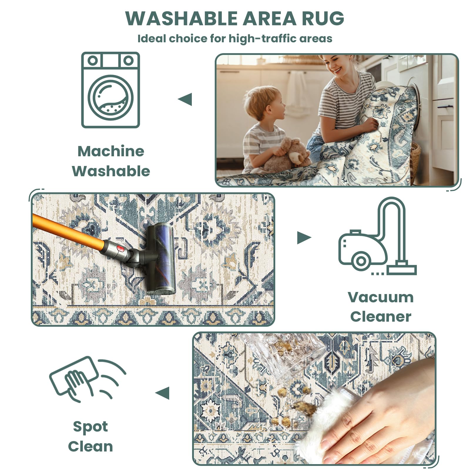 - Machine Washable Rugs 6x9: Low-maintenance 6x9 area rugs, it won't trap dirt, small dust and dirt on the surface can be wiped with a rag, broom, vacuum or robot vacuum cleaner. Of course, you can also wash rugs for living room thoroughly in the washing machine for a deep cleaning. Take it out and look brand new. But it is best to use cold water and never use bleach. Innovative one-piece machine washable rugs makes your home cleaning easier