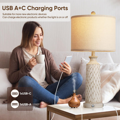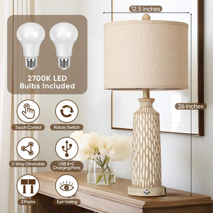 QiMH Table Lamp for Living Room with USB A+C Ports, Farmhouse Bedside Lamps for Bedroom Set of 2, Touch Control 3-Way Dimmable, 26" Modern Off-White Resin Nightstand Lamp, Included 2700K LED Bulbs
