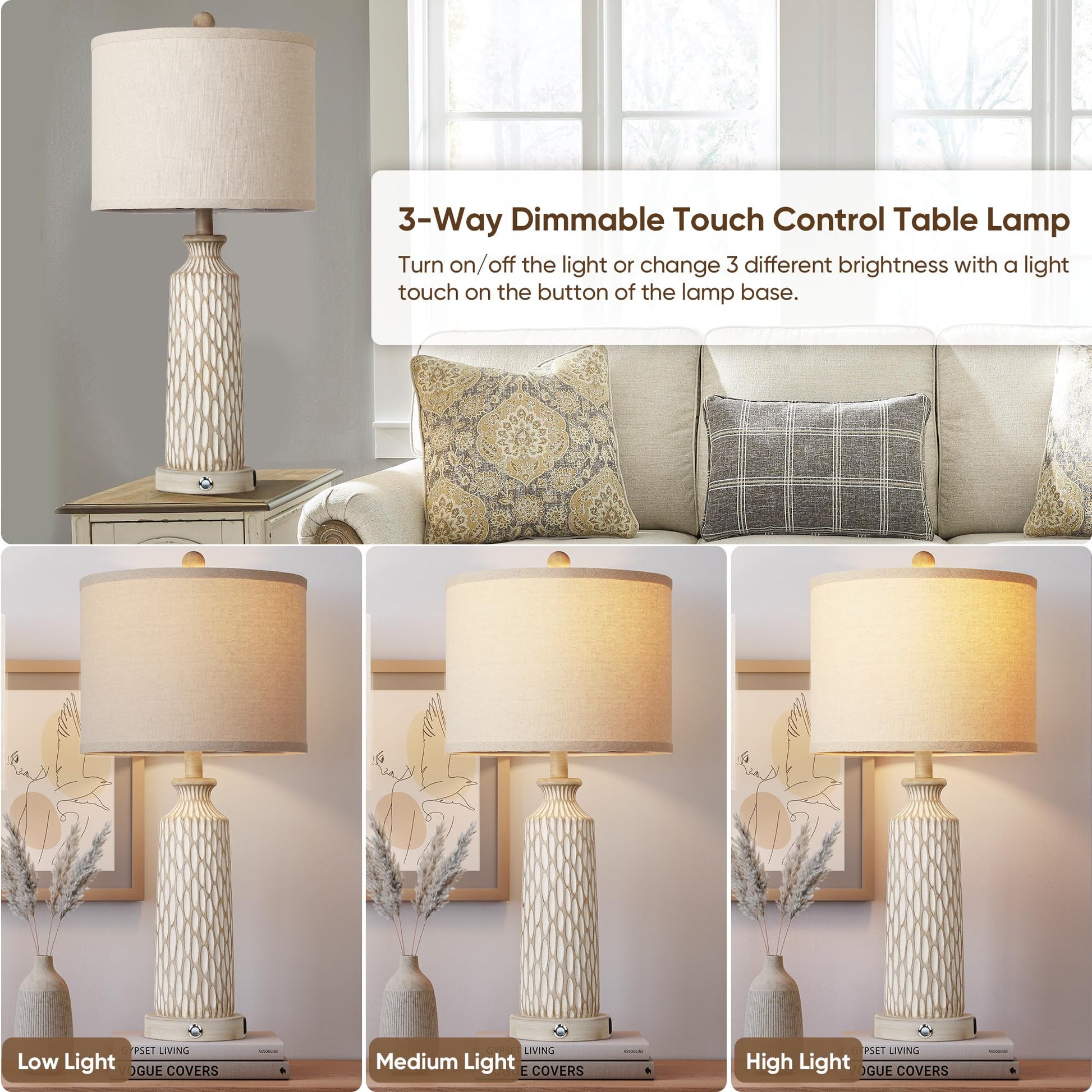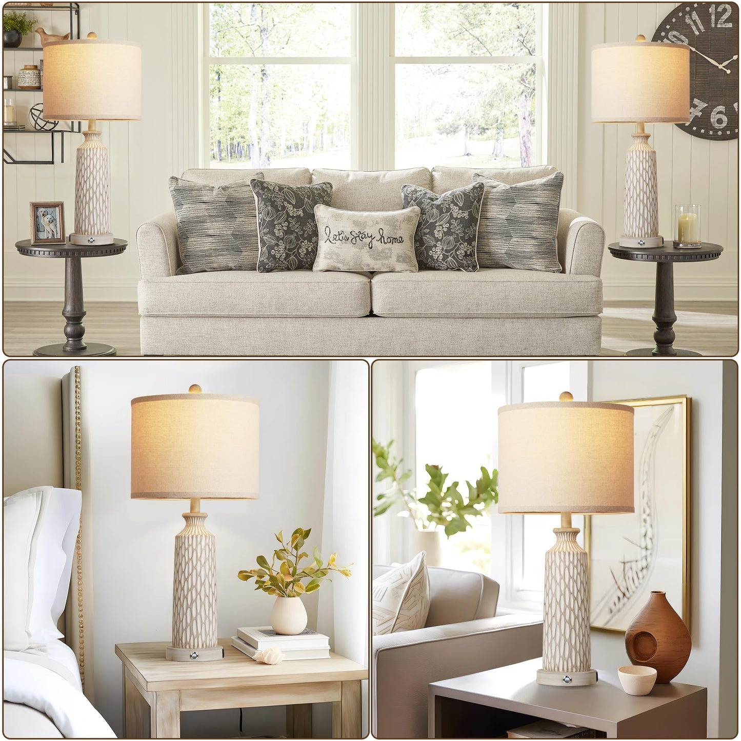 - 【Rustic large table lamps】: The column lampstands of the living room lamps are coated with a layer of beige white finish with a decorative vertical pattern, elegant and beautiful. Up top are straight cylinder white fabric shades that match 2700K warm light creating a cozy and clean finish. The light color tones and elegant lamp body complete the look and make the lamps for living room attract the eyes' attention and are suitable for a bedroom, living room, foyer and more space