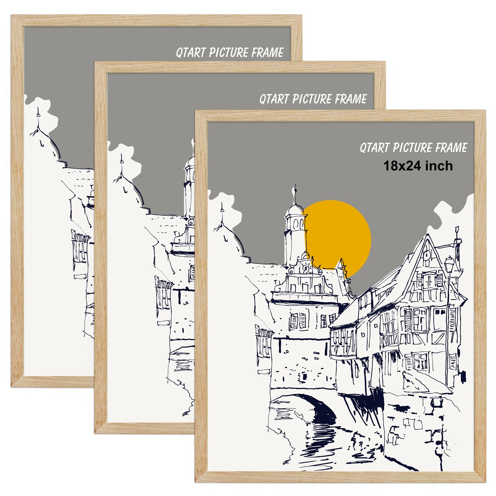 QTART 18X24 Picture Frame, 18x24 Frame Natural Oak Wood Poster Frame for Photo Wall Mounting Tabletop Display, 3pack 18 by 24 Picture Frames
