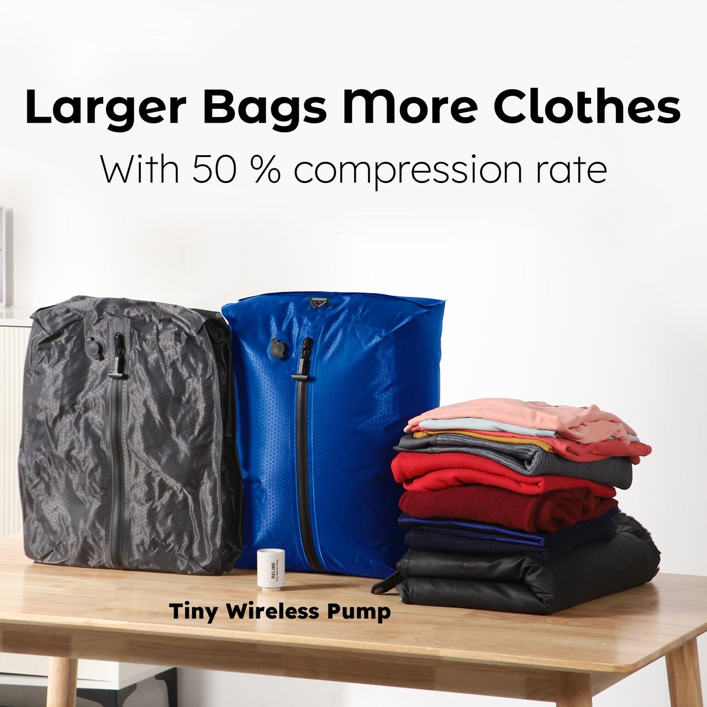 Relime Vacuum Bags for Travel Luggage with Wireless Pump, Revolutionary Reusable Compression Bags for Carry On Suitcases and Backpack, Vacuum Seal Packing cube for Cloth (2PC + PUMP Gray & Blue)