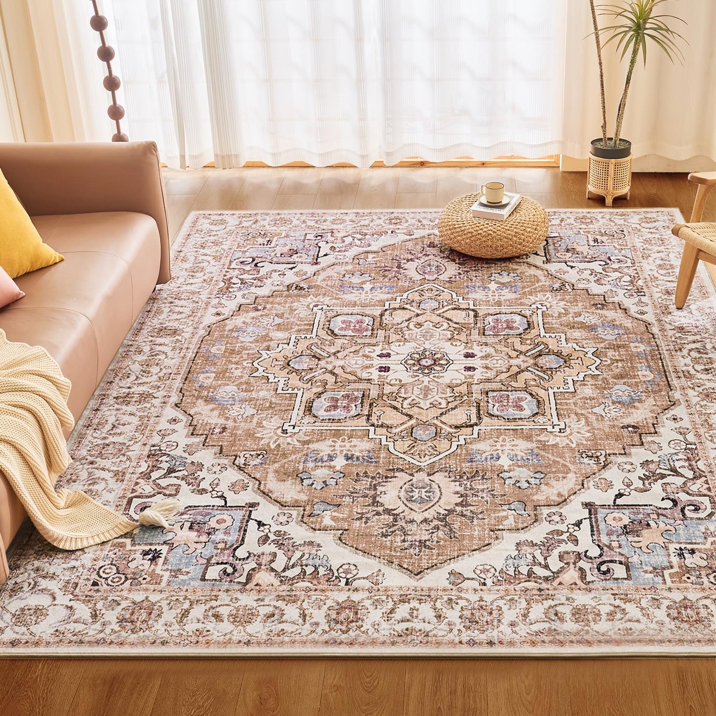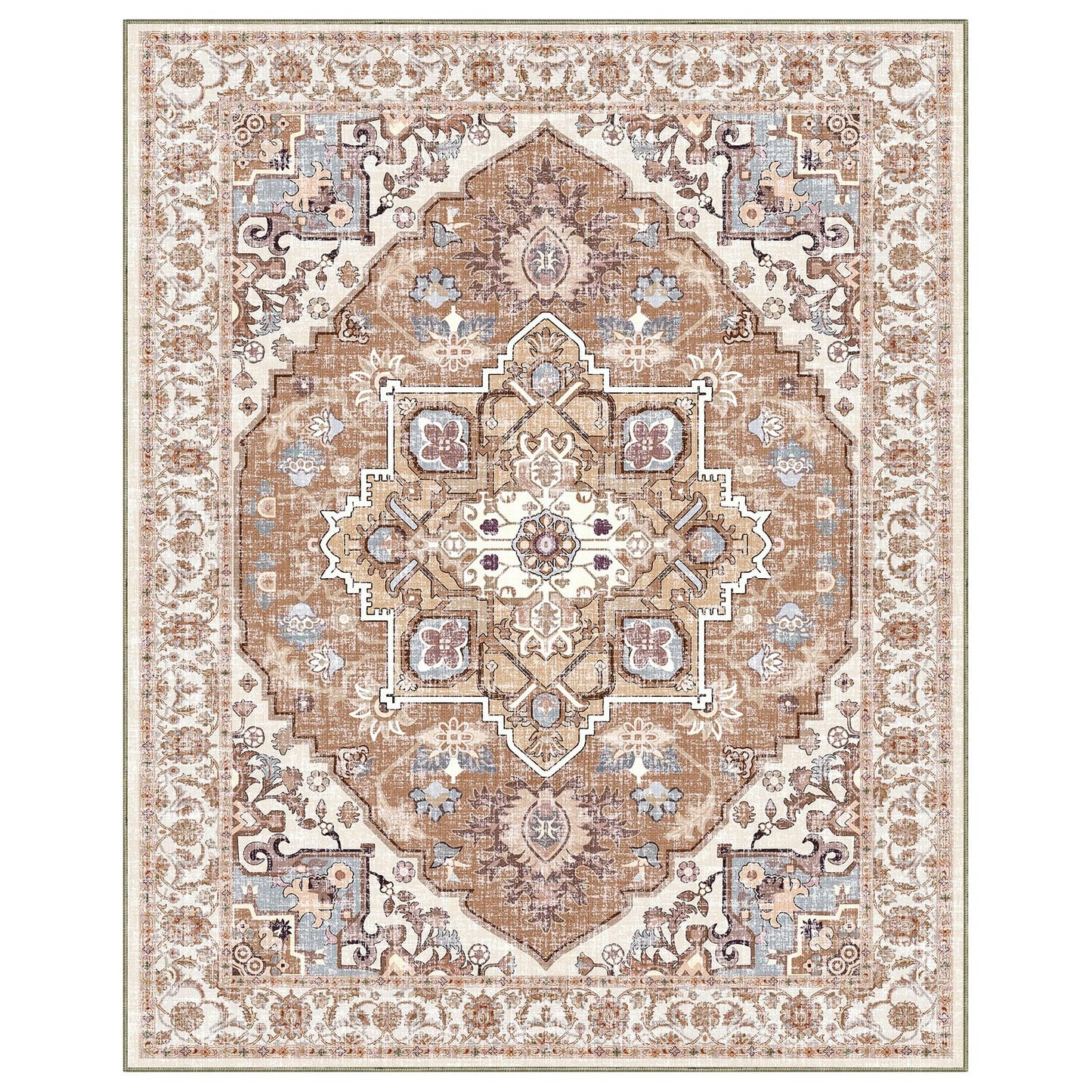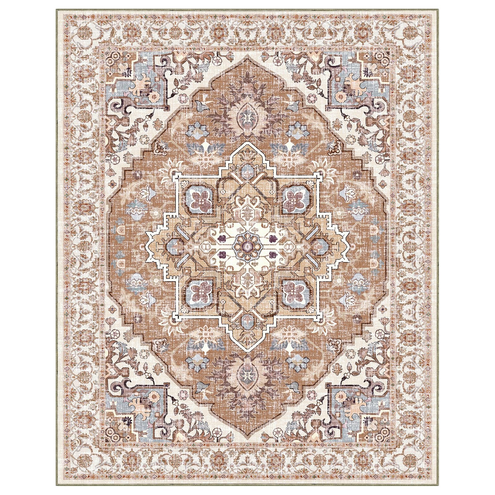 ROCYJULIN 8x10 Area Rug for Living Room and Bedroom - Low-Pile Faux Wool Carpet With Non-Slip TPR Backing, Large Washable for High Traffic Areas - Coffee Beige & Cream