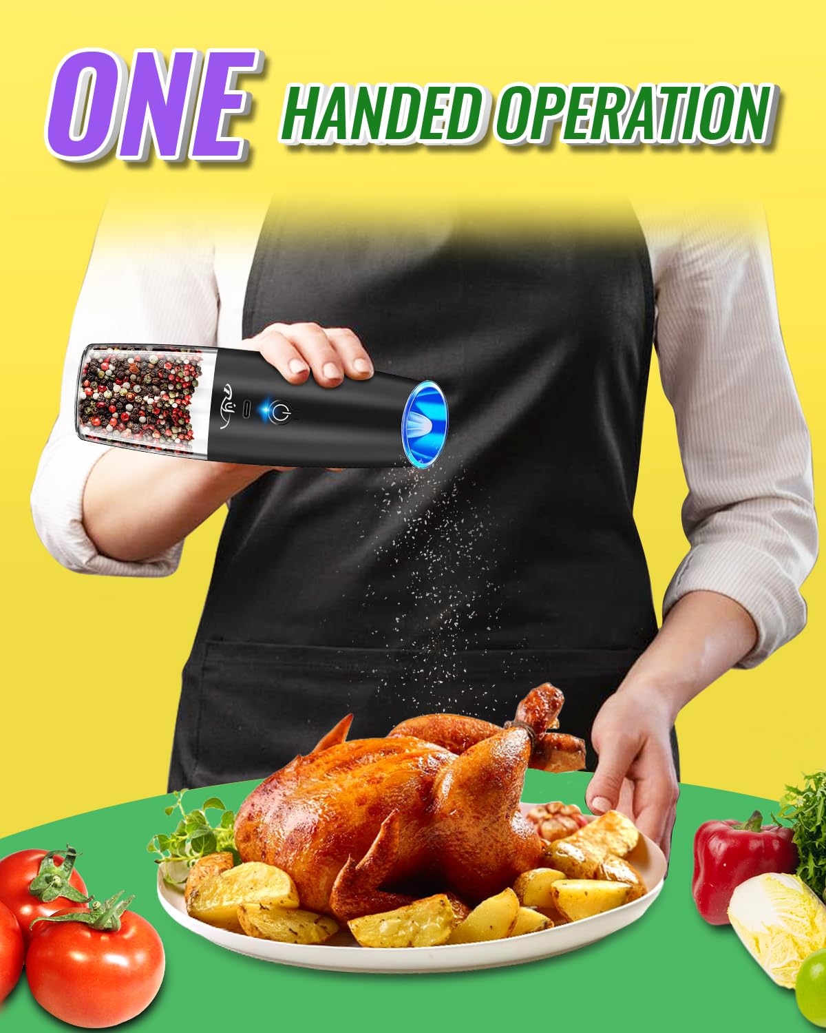 - 【COMPATIBLE WITH GRAVITY SENSING】 - Compatible with Gravity salt and pepper grinder set features compatible gravity sensing for easy one-handed operation. Simply flip the pepper grinder over and enjoy freshly ground spices. The motor of the automatic pepper and salt grinder set has been powerfully upgraded to grind spices faster, more efficiently, finer and more evenly, and last longer.