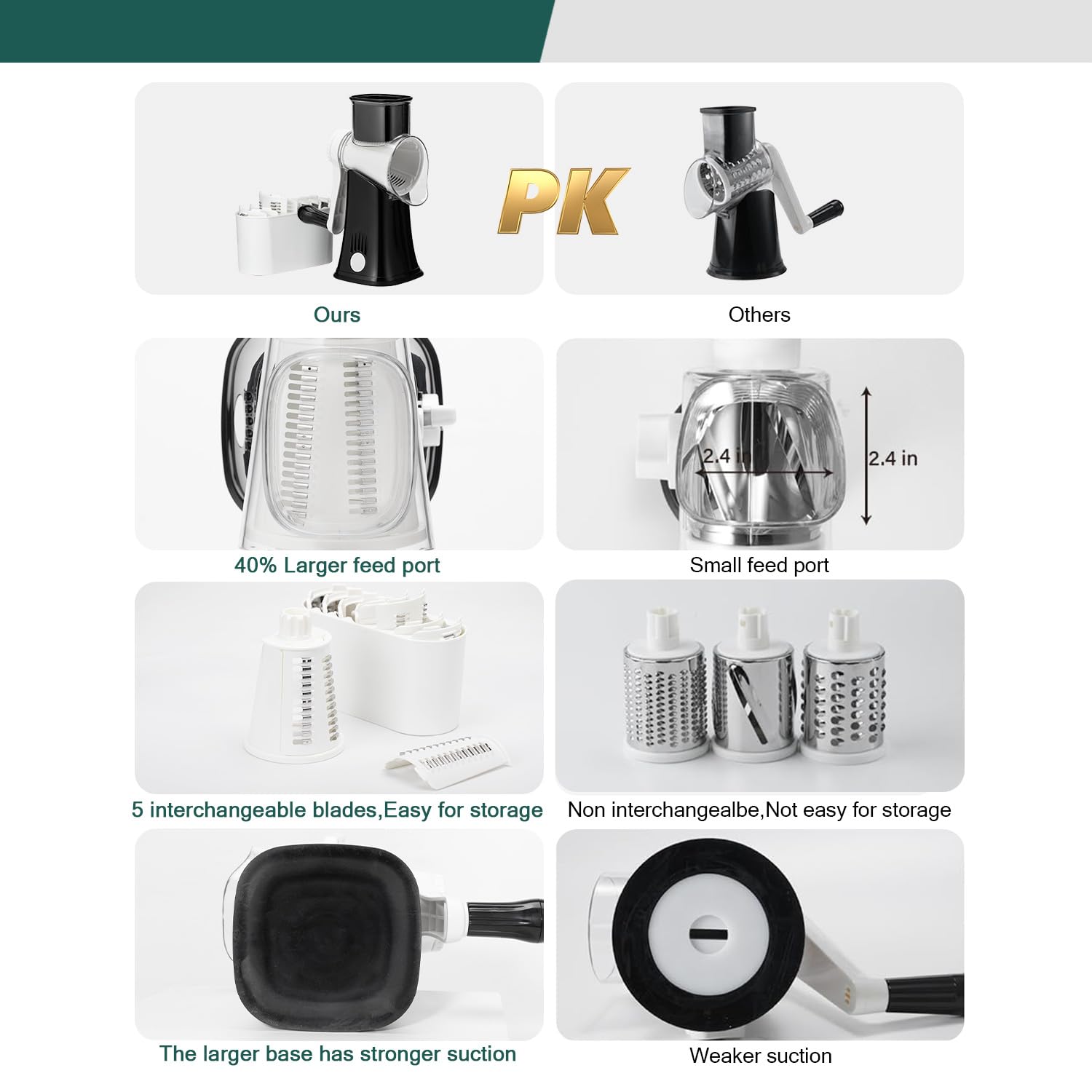 - UPGRADED CHEESE GRATER;Our rotary cheese grater is upgraded with 2.48in enlarged rollers, 40% more space than other machines, 5 different interchangeable slicing accessories, as well as equipped with a storage box and enlarged suction cups for a more stable fixation on the countertop.