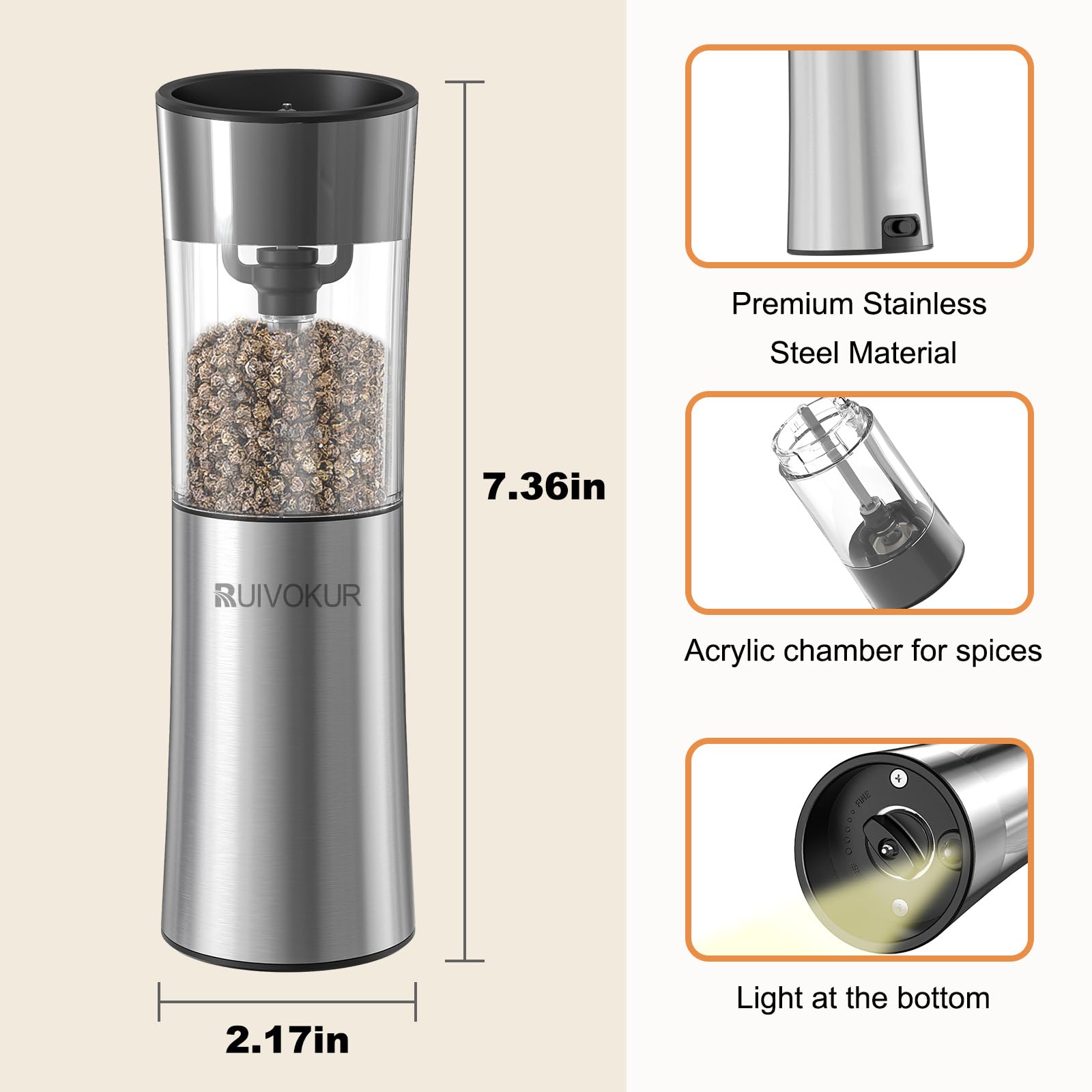 - Perfect & Useful Gift: the electric salt and pepper grinder set is a practical tool that can be used regularly, it's a wide application and is suitable for various occasions such as housewarmings, birthdays, weddings, etc. Our automatic rechargeable salt and pepper grinder set can elevate the cooking experience, making it easy to add freshly ground pepper to dishes and add more delicious flavors.