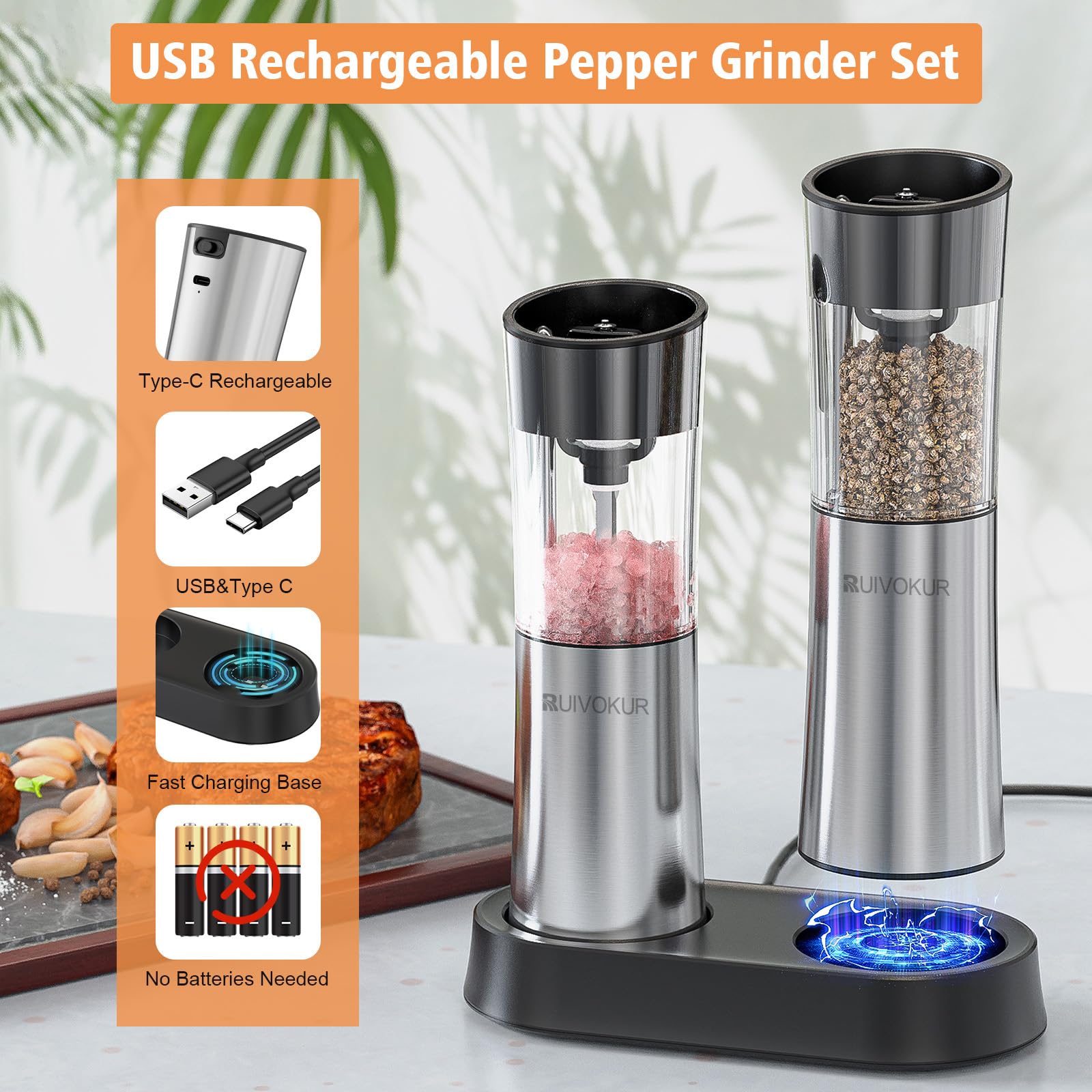 RUIVOKUR Automatic Salt and Pepper Grinder Set, Electric Salt and Pepper Grinder Set Rechargeable with Charging Base, 2 Pack USB Electric Pepper Grinder with Adjustable Coarseness for Kitchen