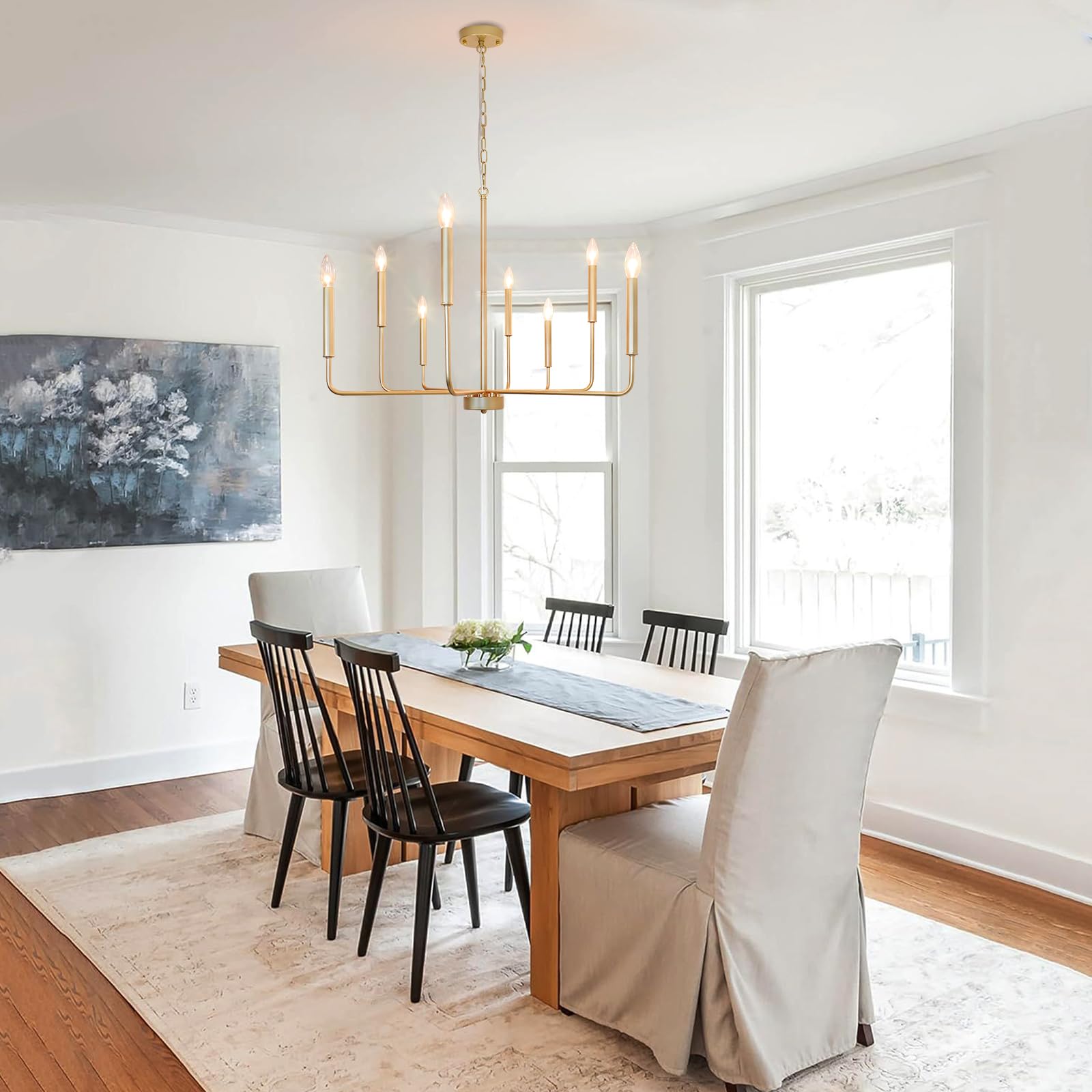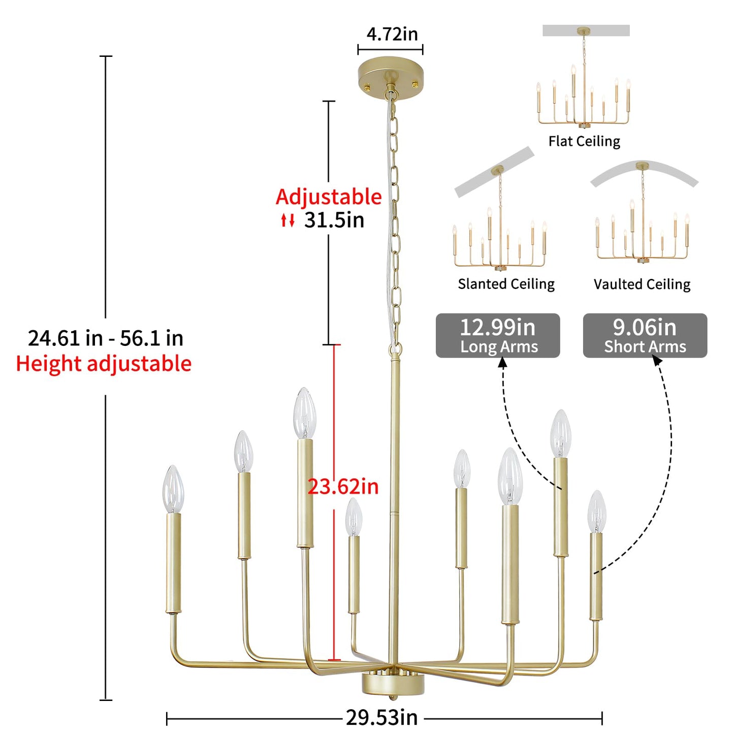 - ใ๐๐๐ข๐ ๐ก๐ญ ๐๐๐ฃ๐ฎ๐ฌ๐ญ๐๐๐ฅ๐ใModern farmhouse chandelier has an adjustable 31.05โ iron chain. You can adjust the hanging height from 24.61โ to 56.1โ to fit a variety of spaces. Lamp 29.53โ width arm to arm x 23.62โ Lamp height x Overall Length (56.1 in). gold dining room chandelier could work on all ceilings including flat, slanted, vaulted or sloped ceiling.