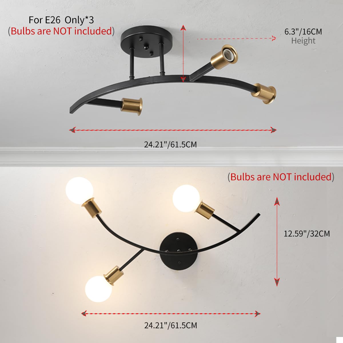 - Minimalist sputnik light fixture:This Modern sputnik ceiling light Fixture by 2 branch and can hold 3 light bulbs(bulbs not included).It is finished with a combination of spray painting and plating in black and gold,for various decoration styles and scenes
