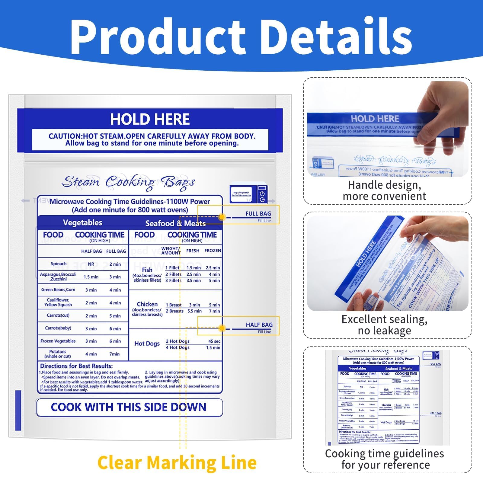 - Microwave Steamer Bag: each steam bag comes with clear cooking instructions for various foods, just follow the time guide to cook the perfect meal; Simplify meal preparation, even beginners can quickly and easily cook delicious food