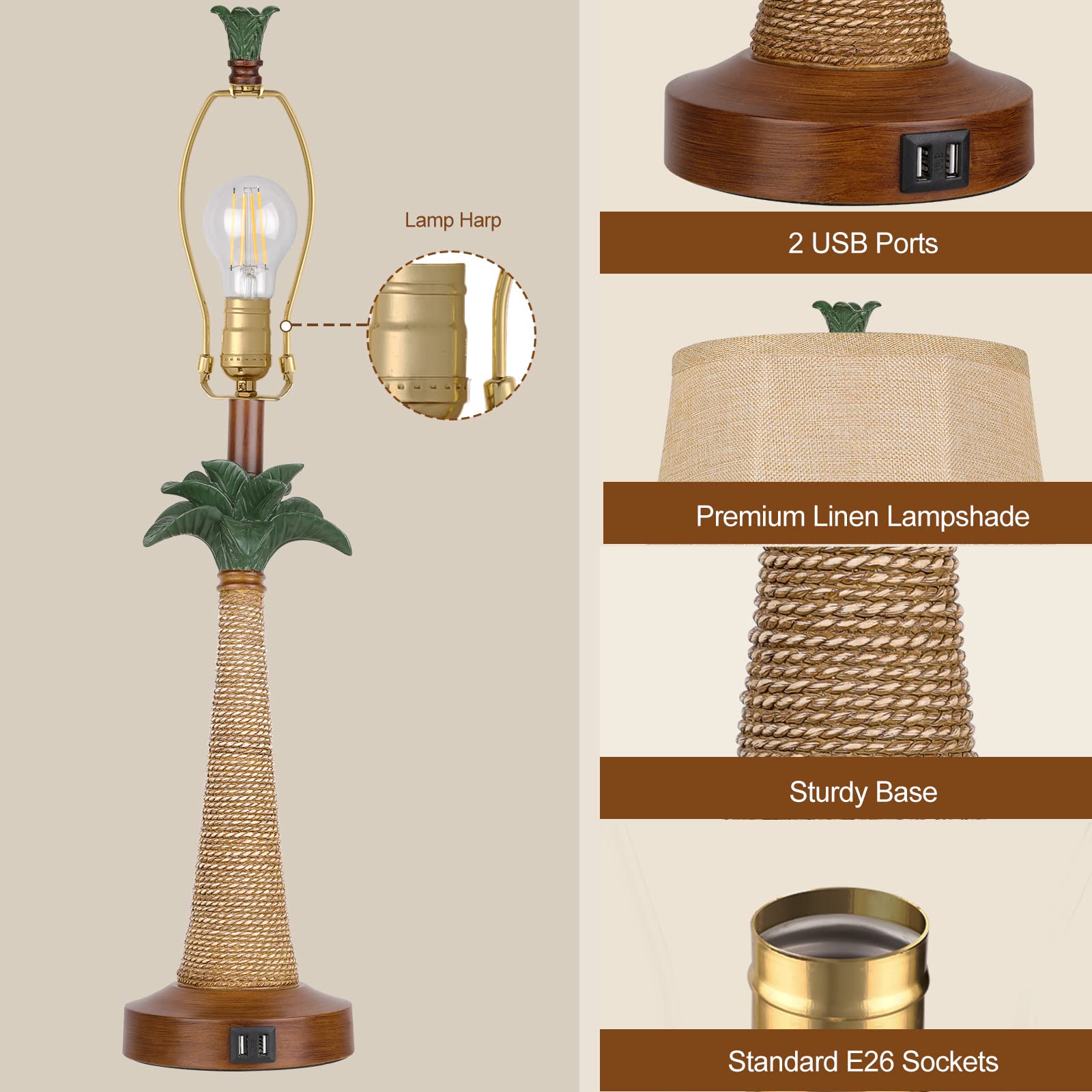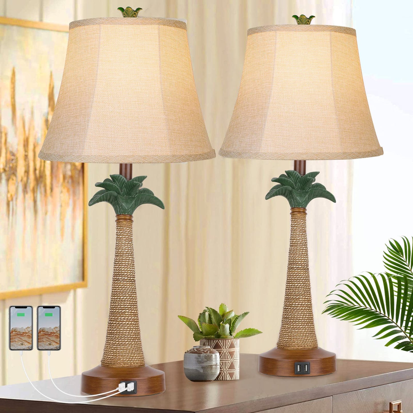 Set of 2 Coastal Palm Tree Table Lamps with 2 USB Ports for Living Room Beach Nautical Bedside Lamps for Bedroom Tropical Nightstand Lamps for Home Decor