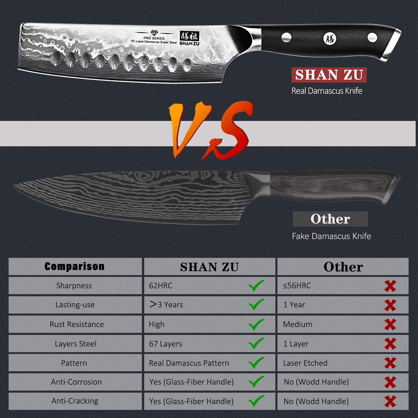 - REAL Damascus Knife, not Lazer Etched: SHAN ZU Damascus chef knife layering sheets of carbon steel, and applies excessive heat treatments with repeated folding and forging until the blade pattern is formed. The pattern gets more visible after polishing