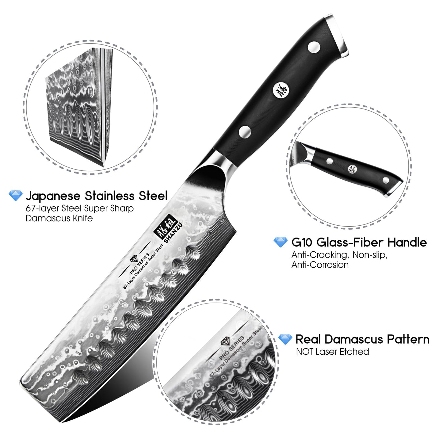 SHAN ZU Chef Knife, Damascus Professional Extra Sharp Kitchen Knife, Japanese High Carbon Super Steel Nakiri Knife with Ergonomic G10 Glass Fiber Handle