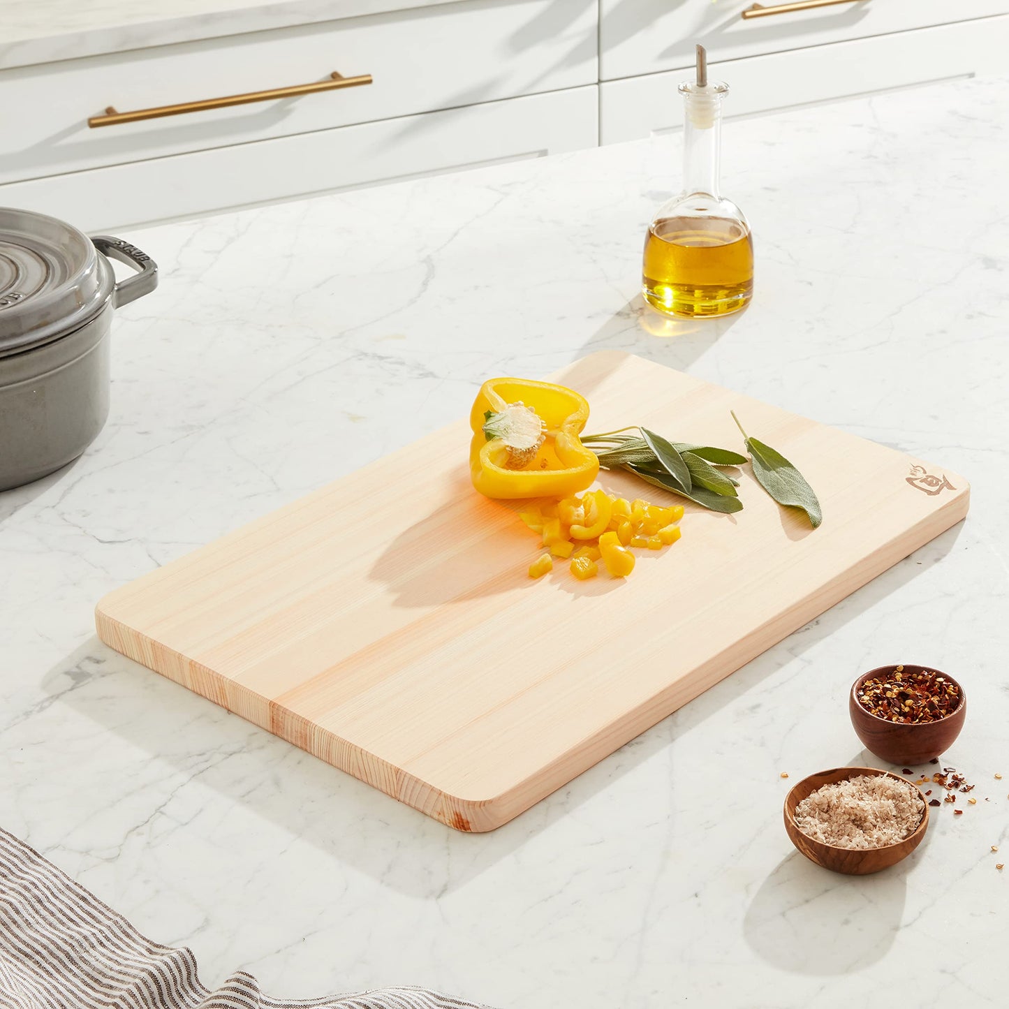 - LARGE CUTTING BOARD: The Shun Cutlery Large Hinoki Cutting Board is expertly designed to be the perfect cutting surface for any knife. Medium-soft wood "gives" as you cut, helping to preserve knife edges.