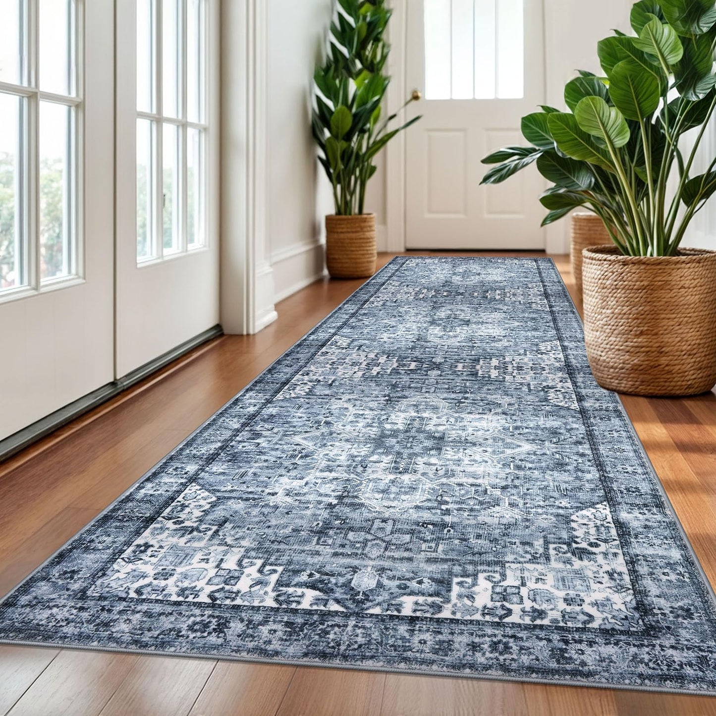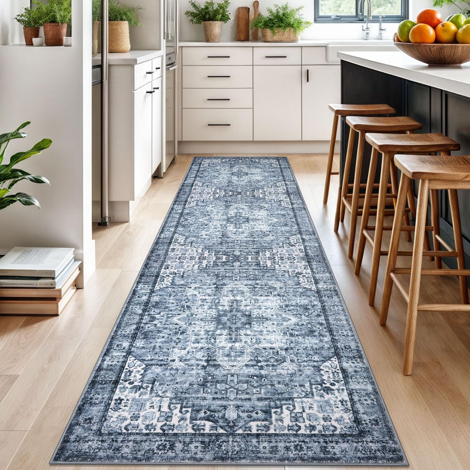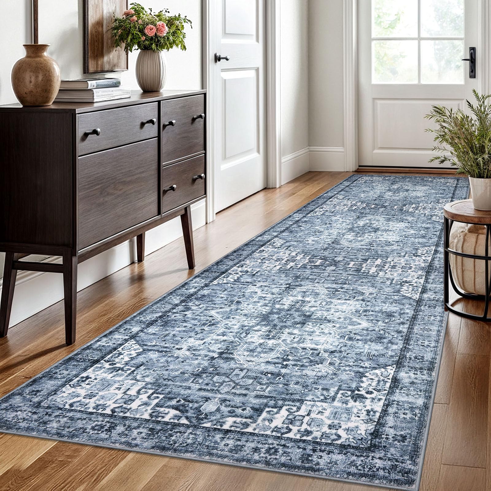 SIILOOM 3x10 Blue Washable Rug for Entrance, Soft Printed Area Rug, Non-Slip Kitchen Rugs, Low-Pile Medallion Indoor Door Mat, Small Farmhouse Carpet for Entryway Kitchen Foyer Bedside