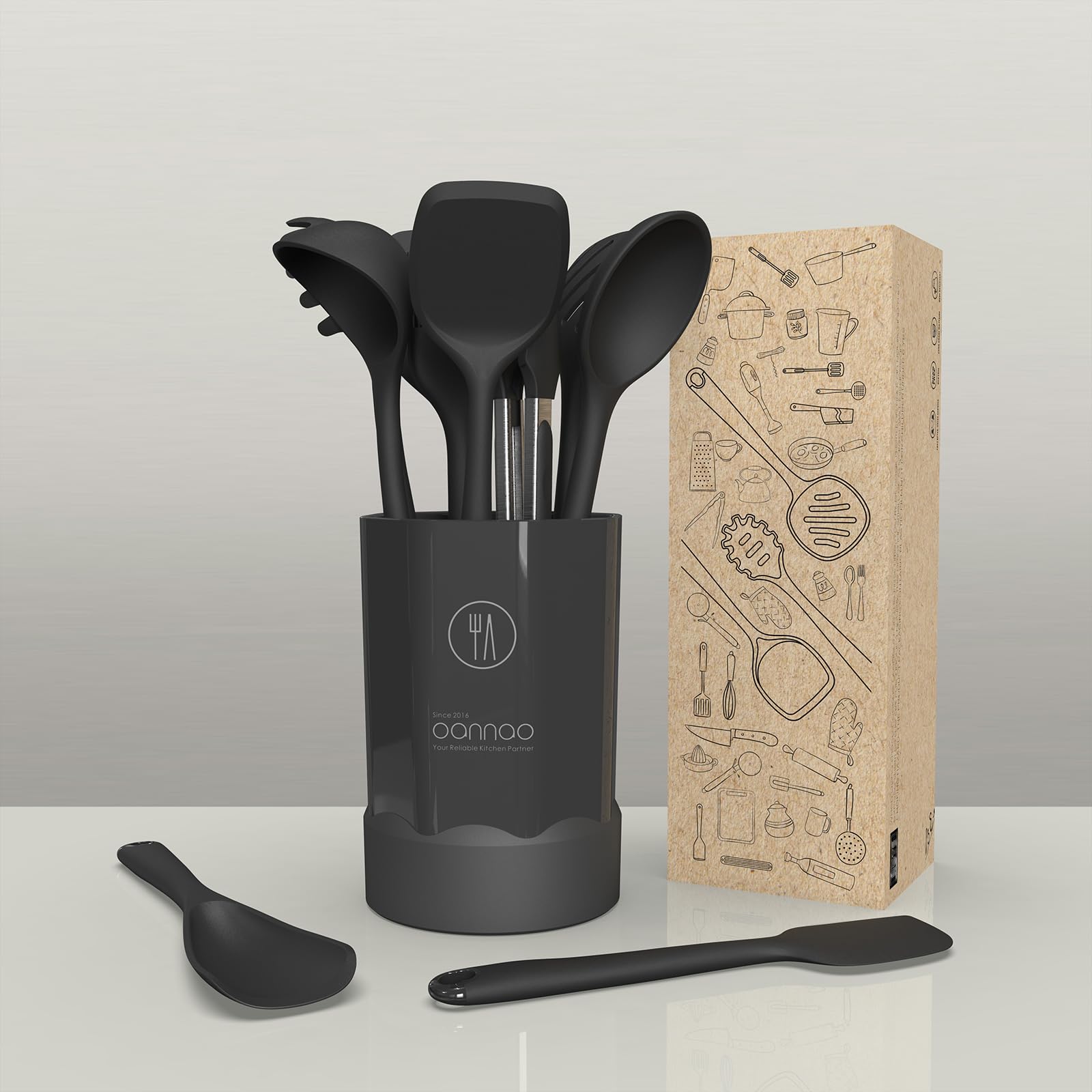 - VERSATILE KITCHEN UTENSILS SET: Oannao specializes in designing and producing silicone kitchen utensils.This essential set includes a deep soup ladle, pasta fork, spoonula, slotted spoon, kitchen tong, slotted turner, multifunction spoon, brush, solid turner, large spatula, and holder