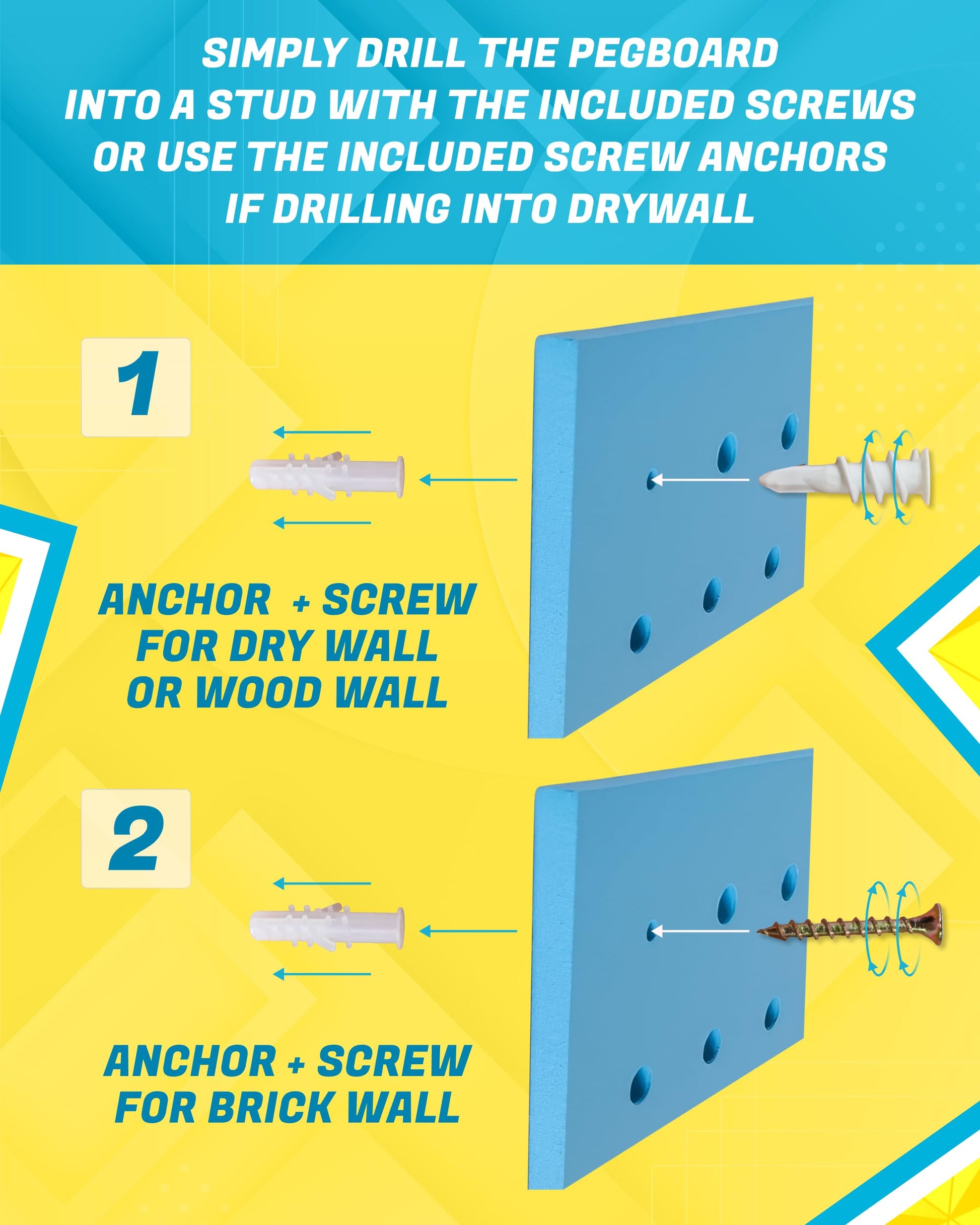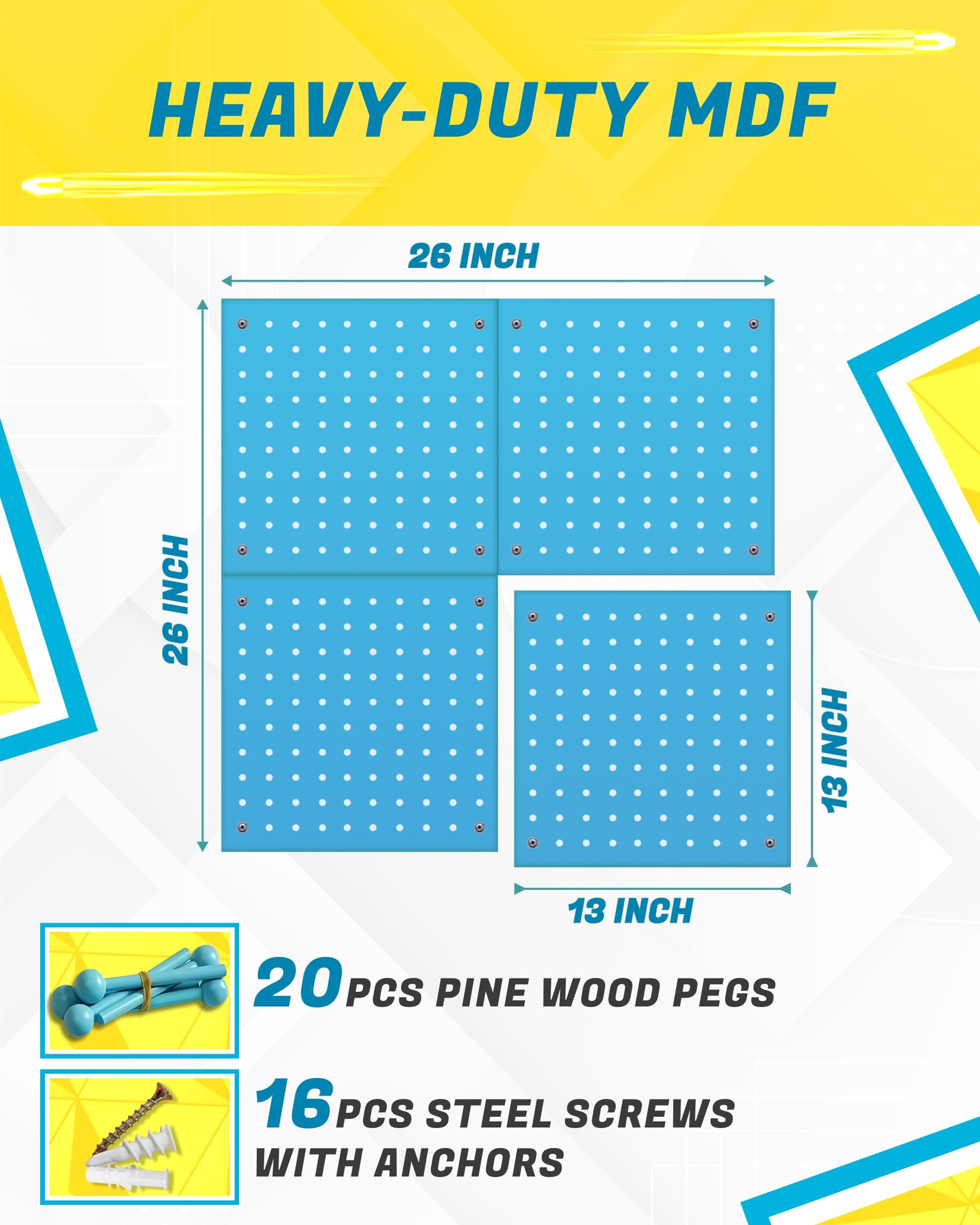 - [ Easy Assembly Wall Tool Organizer ] - This pegboard organizer comes in a set of 4 square boards measuring 13 x 0.32 x 13 Inches. Assemble them to create a larger blue pegboard that perfectly fits your wall space
