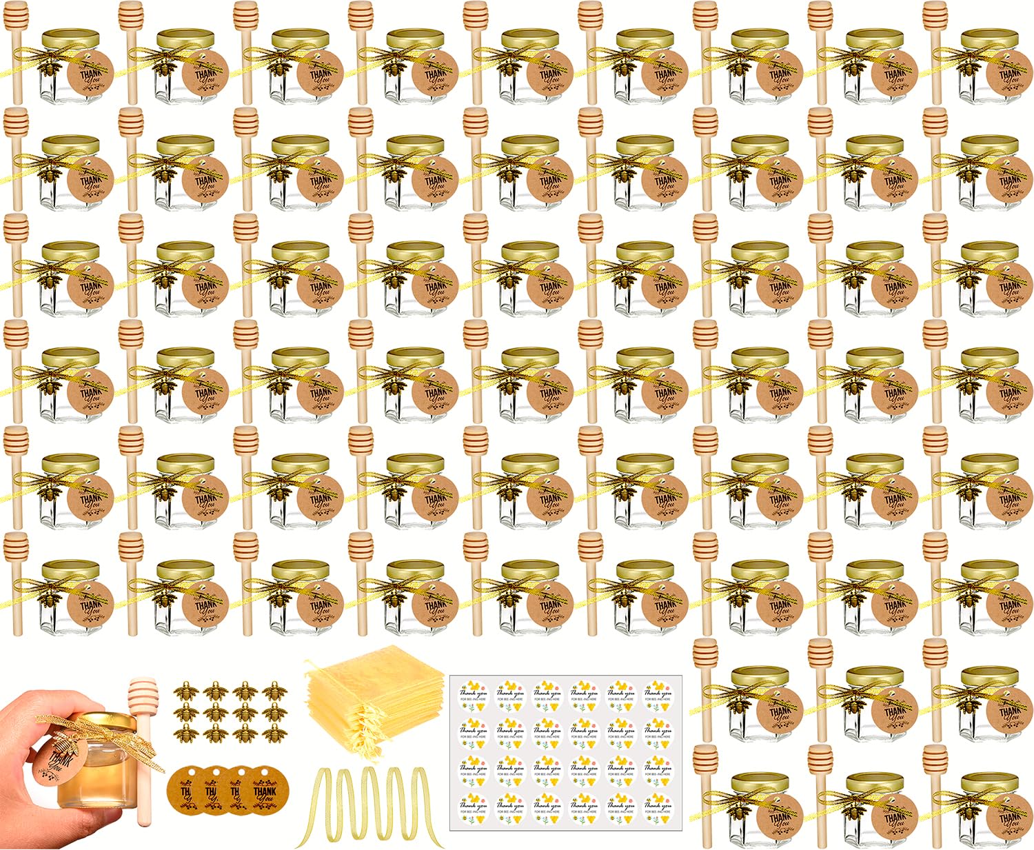 - What You Will Get: Our 1.5oz glass honey pot is come with Bee-Themed Accessories, including 60 pcs glass honey jars and wood dippers, 60 pcs gold lids, 36m gold fabric ribbons, 60 pcs bee charms, 60 pcs Gold Organza Bags and 60 pcs thank-you tags