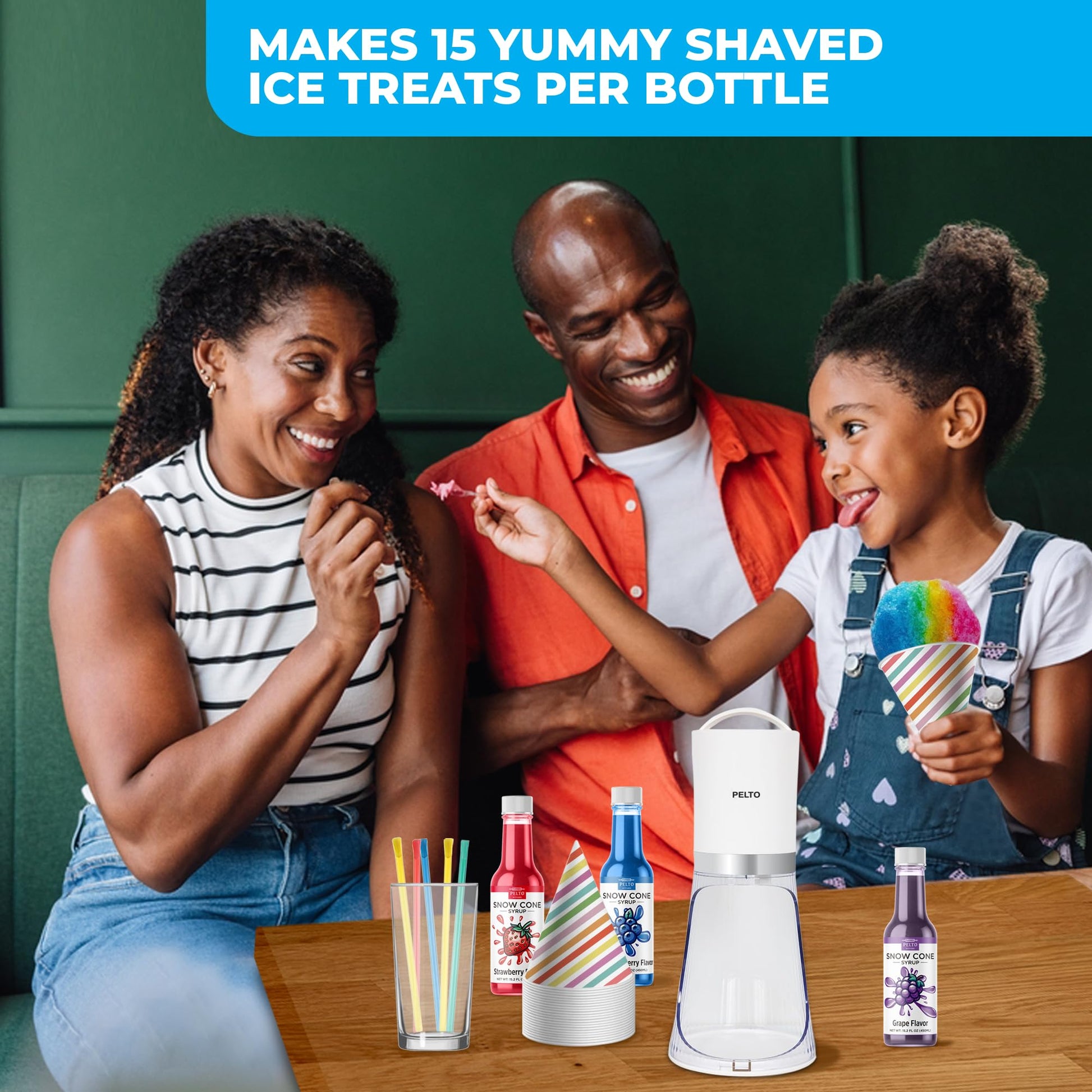 - Complete Kit for Endless Fun – Includes an electric shaved ice machine, 3 syrups (Strawberry, Blue Raspberry, Grape), 25 cone cups, 25 spoon straws, and 4 reusable ice molds.