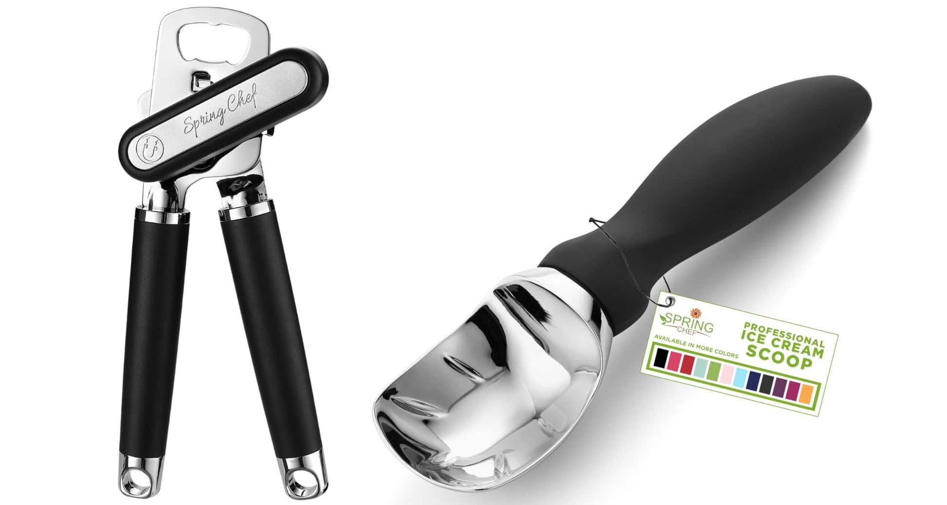 Details: Spring Chef Stainless Steel Can Opener with Smooth Edge & Heavy Duty Professional Ice Cream Scoop - 2 Product Bundle - Black