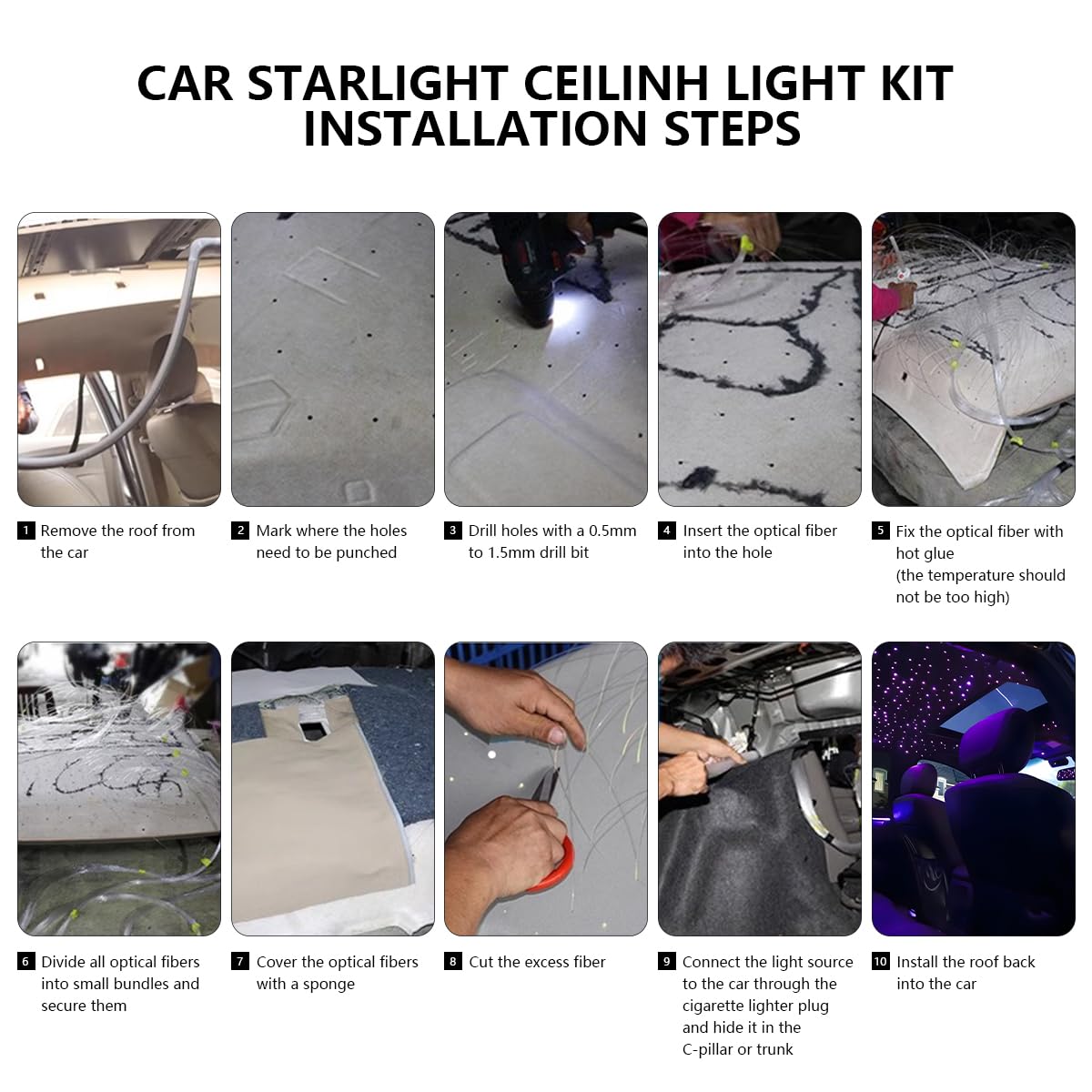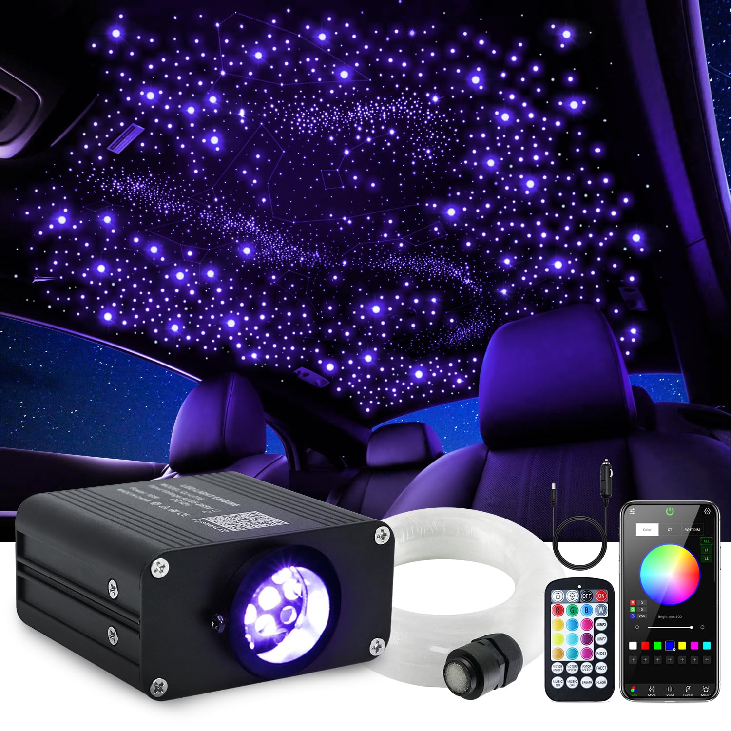 - COMPACT SIZE STARLIGHT HEADLINER KIT: 16W high power small size Light Engine, easier to hide while providing higher brightness light effect for your car. Equipped with 300pcs*0.03in*9.8ft end grow fiber optic made of PMMA plastic, soft and easy to bend, high light energy utilization, no heat, no conductivity, waterproof and safe.