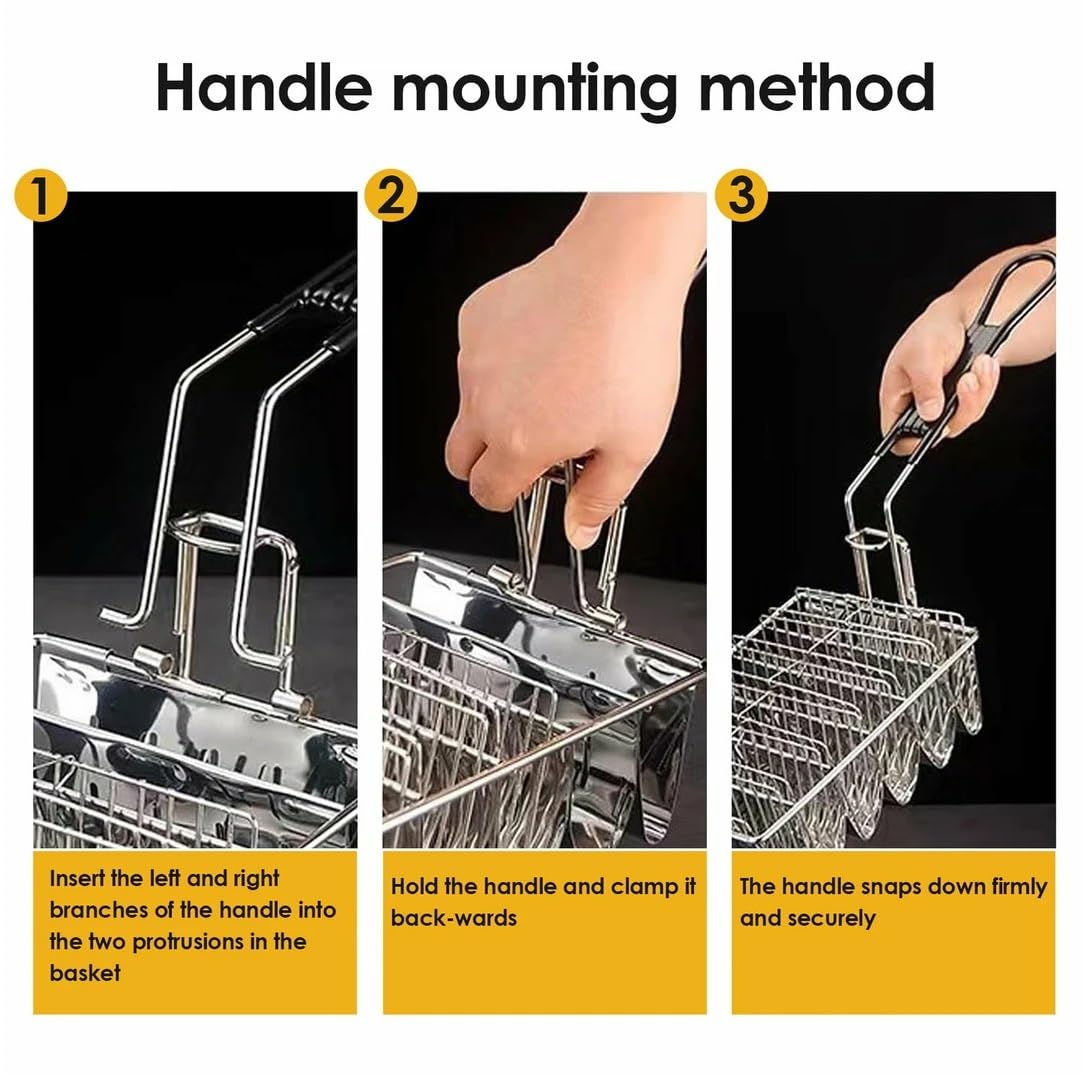 • DETACHABLE LONG HANDLE: Equipped with a long handle that features a rubber grip, this taco basket prioritizes user safety during cooking. The handle keeps your hand at a safe distance from hot oil, allowing for a comfortable and secure cooking experience. This thoughtful design ensures you can fry with confidence, making it an essential tool for any kitchen