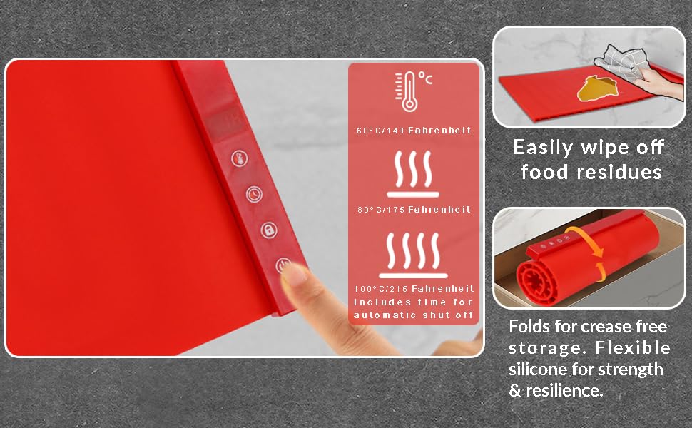 - Portable and Easy to Store: The heat mat for food can be rolled up, ensuring hassle-free transport and setup. A carrying sleeve and velcro strap are provided for convenient transport and storage.