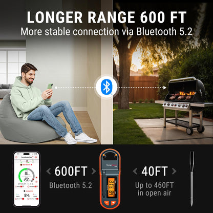 - 【600 ft Longer Range】Powered by the cutting-edge Bluetooth 5.2 technology, the bluetooth thermometer delivers readings from up to 600 ft away, allowing you to monitor the cooking progress without being tied to the grill/oven/smoker/rotisserie