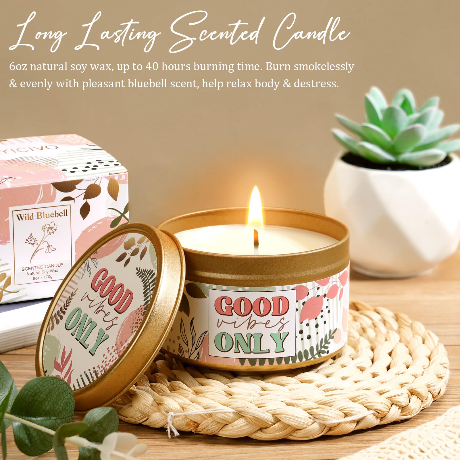 - FINE SCENTED CANDLE FOR WOMEN: The 6oz Bluebell scented candle included in this Coworkers Christmas Birthday Gifts Boss Lady Gifts for Women Female is crafted from plant essential oil & premium wax. It burns smokelessly & evenly for up to 40 hours, filling the room with a delightful fragrance that fosters a calm and peaceful atmosphere, helping relax her body & calm her mind, ideal for Bath, Massage, Spa, Yoga, Rest, Work, etc. "GOOD VIBES ONLY" convey a positive attitude & cheer her up