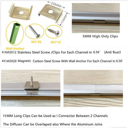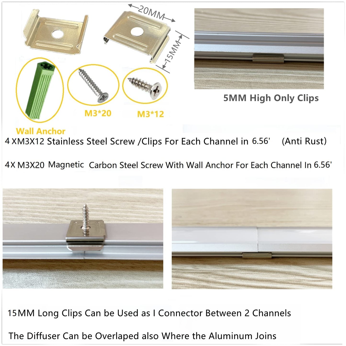 - The package included Aluminum channel 6.56FTX10,Milky PC Cover 6.56FTX10 ,Stainless Steel Countersunk screwX40 .Stainless steel Mounting Clips X40 ,End caps With Hole X20,End Caps Without Hole X 20