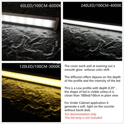 - Milky Diffuser is Easy Snaped Into the Channel, It Does Not Only Protect the Exposed Strip From Dust and Moisture but Also Evening and Smooth Out the Lights Well With 90% Transmittance Rate .The Cover is Protected By Removable Film Initially