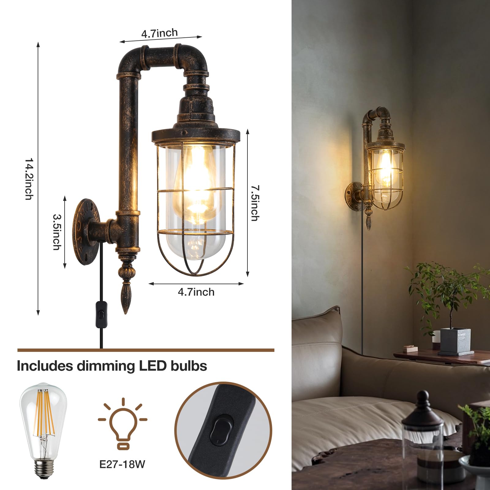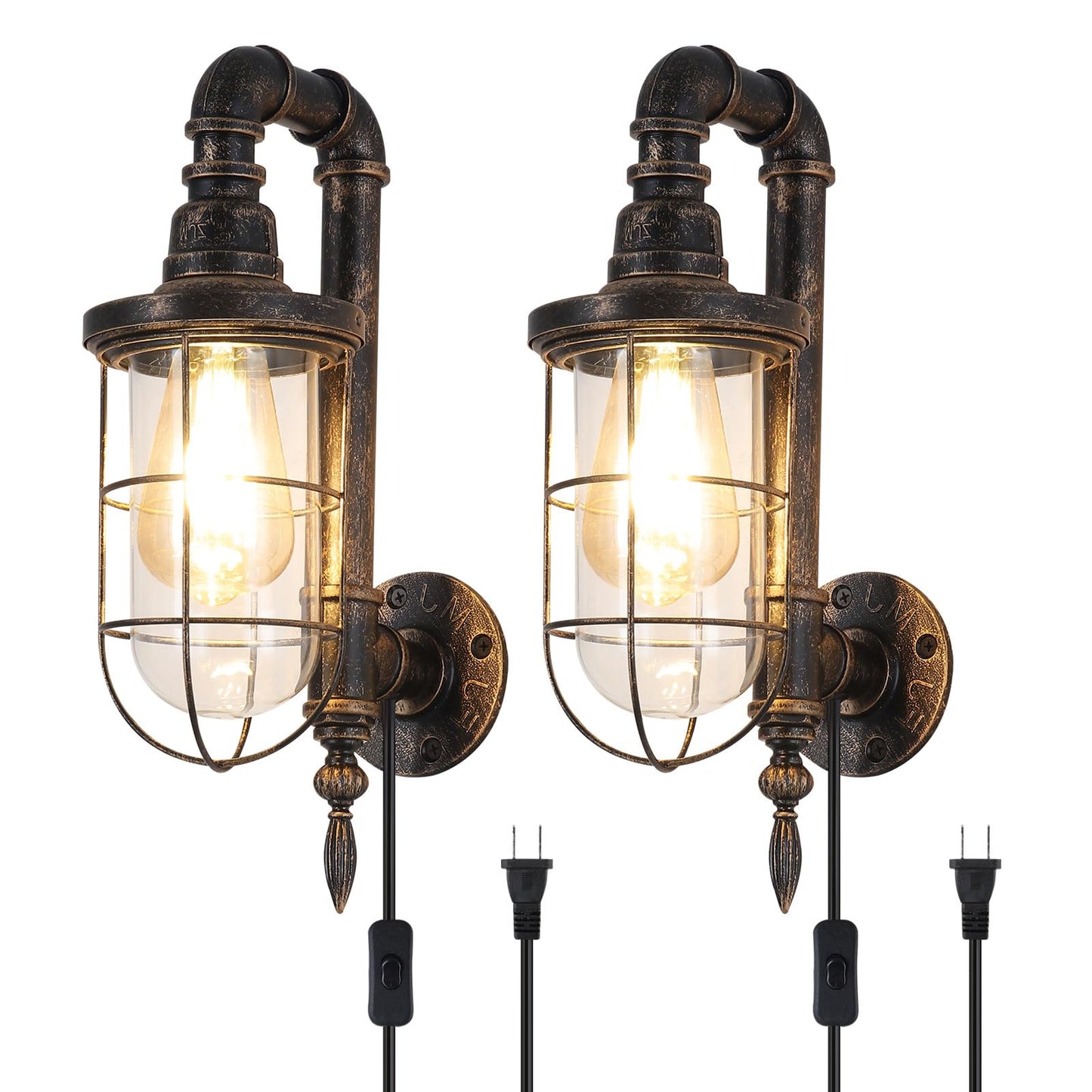 TIGKHAE Industrial Plug in Wall Sconce E26 Edison Antique Wall Lights with 5.9Ft Plug in Cord On Off Switch Rustic Wall Sconces Lighting Fixture for Headboard Bedroom Porch Hallway 2 Pack