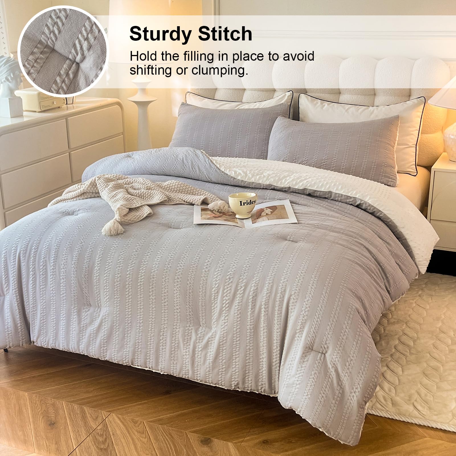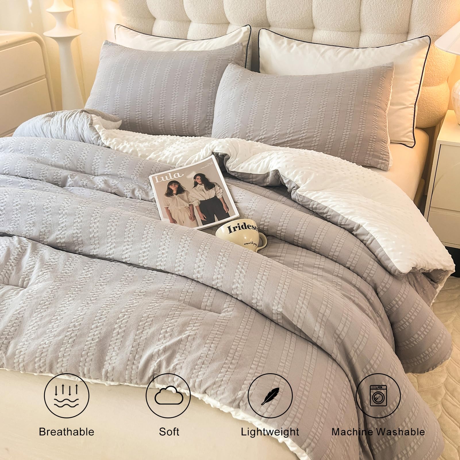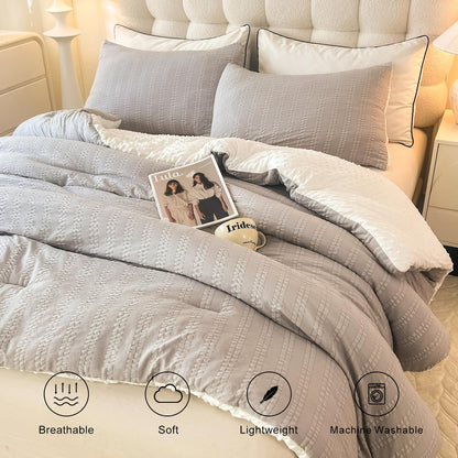 tohrisa Boho Comforter Set Queen Size Striped Pleats Bohemian Seersucker Bedding Set All Season Soft Cozy 3 Pieces Quilt with 2 Pillowcases(90"X90" Grey)