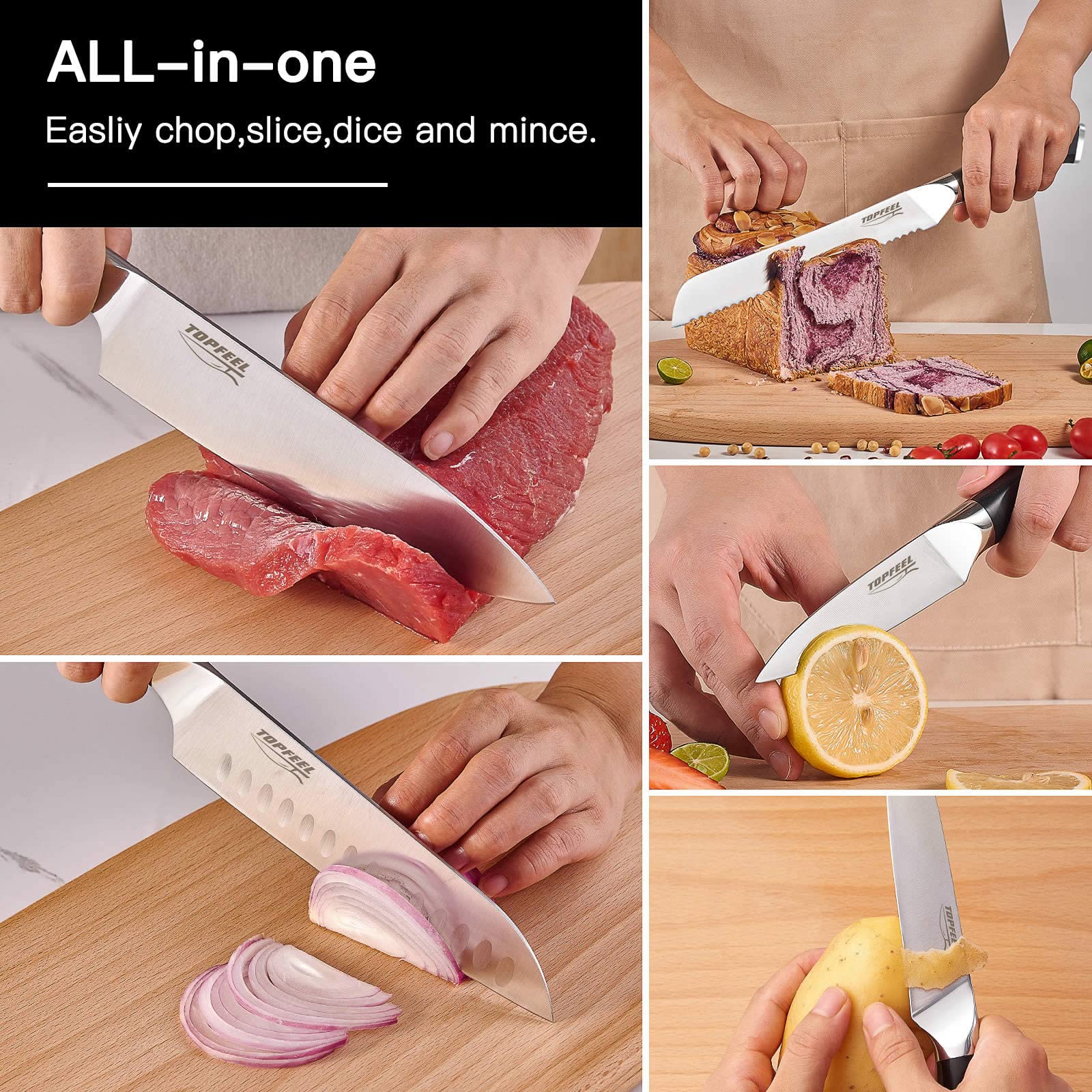 - 【Professional Kitchen Knife Sets】 The chef knife set of 5 including 8'' Chef Knife,8'' Bread Knife, 7" Santoku Knife,5'' Utility Knife,3.5'' Paring Knife, Finger Guard and Sharpener. This multipurpose Japanese kitchen knife set is enough to satisfy your cooking work of chopping, slicing, mincing and dicing of fruits, vegetables, and meat.This sharp kitchen knife is suitable for home and professional use.
