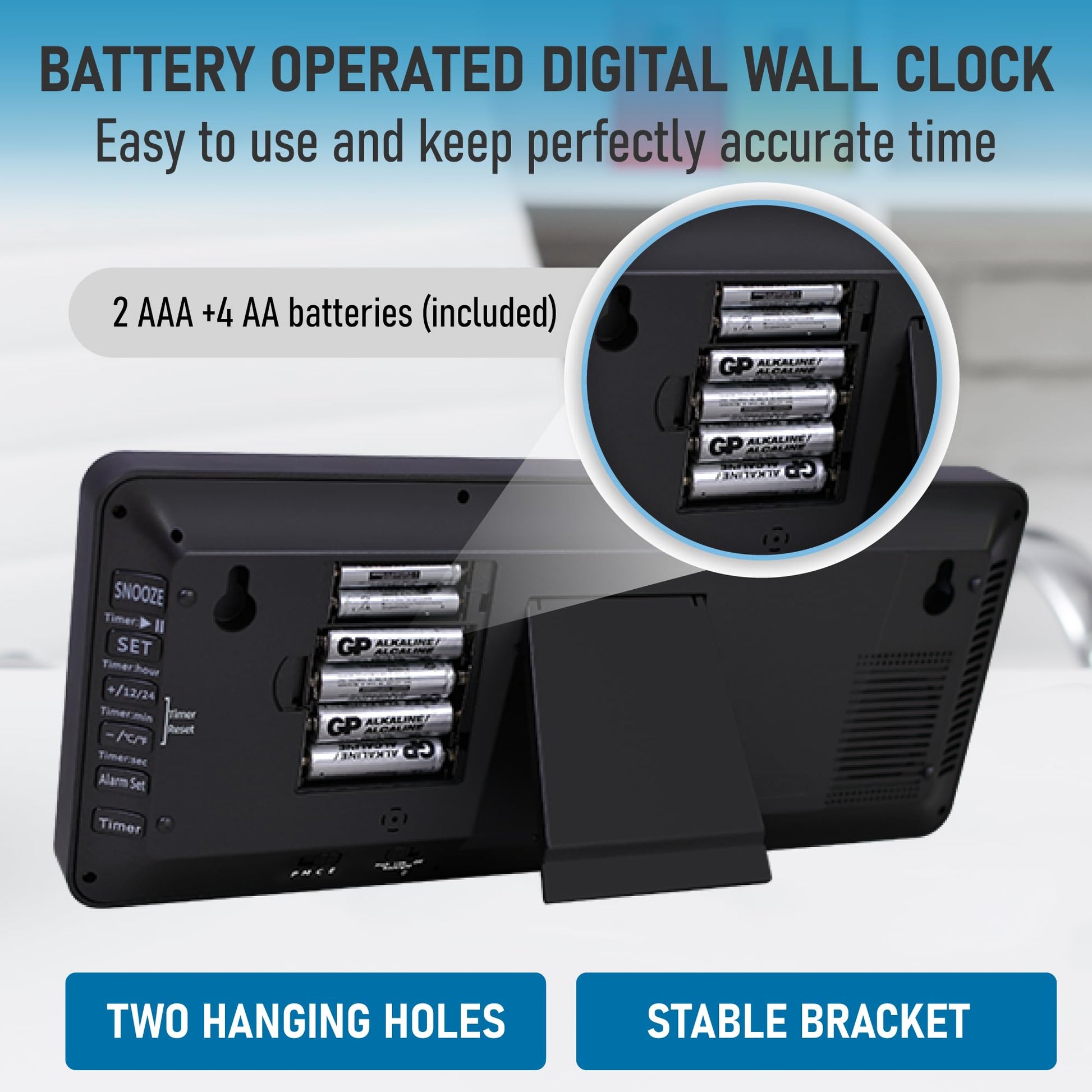 - 【Battery Operated Digital Wall clock】This digital clock is powered by 4 AA batteries and 2AA batteries (Included), you can put the clock wherever you like. There are two keyholes for easy wall mounting and a fold-out backstand for tabletop or shelf placement.