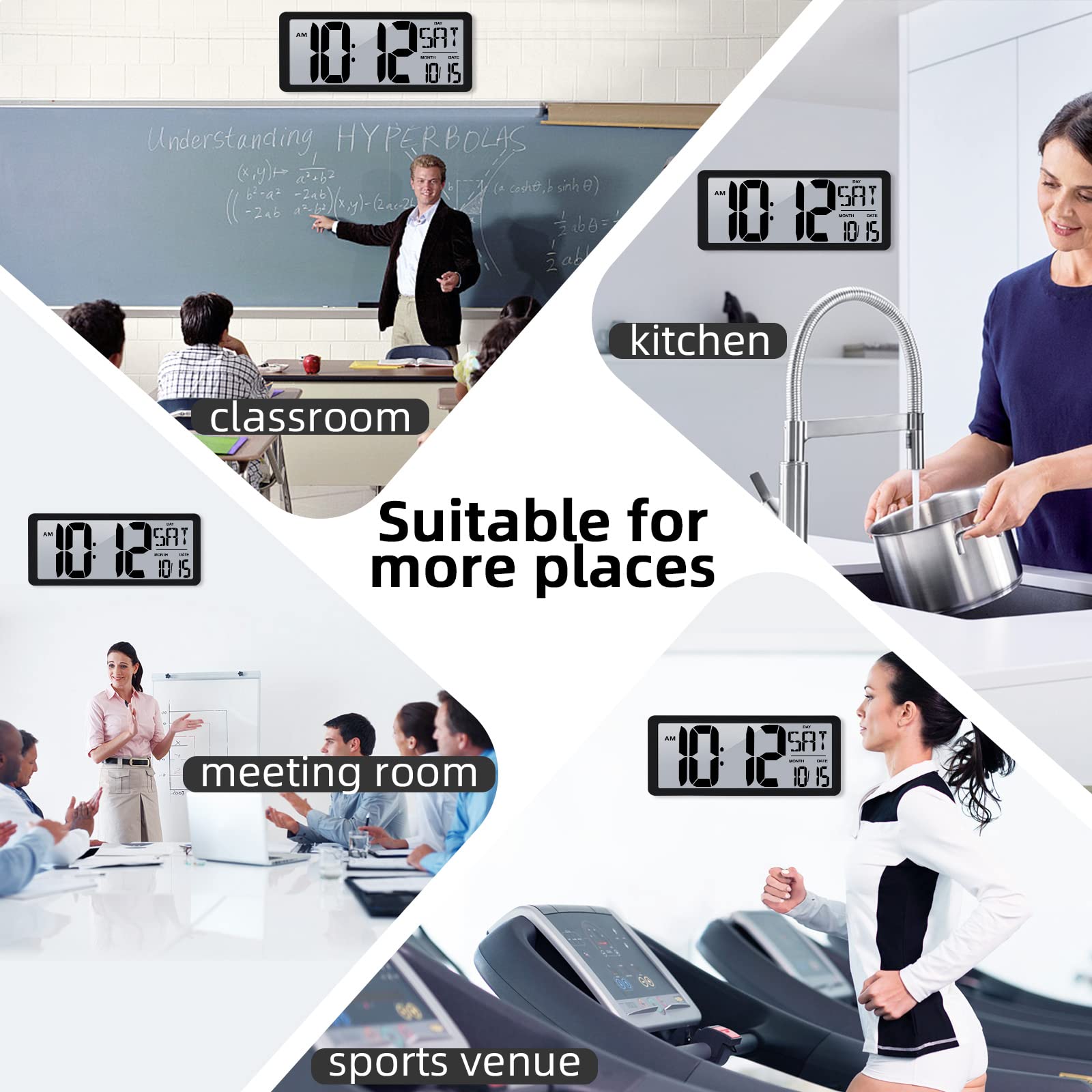 - 【14.2" Large Digital Wall Clock with Backlight】 With large easy to read numbers, large digital clock can be seen at any angle. Featuring a built-in ambient light sensor, once it is dark at night, the screen will automatically light up, allows you can see the time in the dark. User-friendly design, there are 2 levels of adjustable brightness in the dark for your choice. Also, you can turn it off.