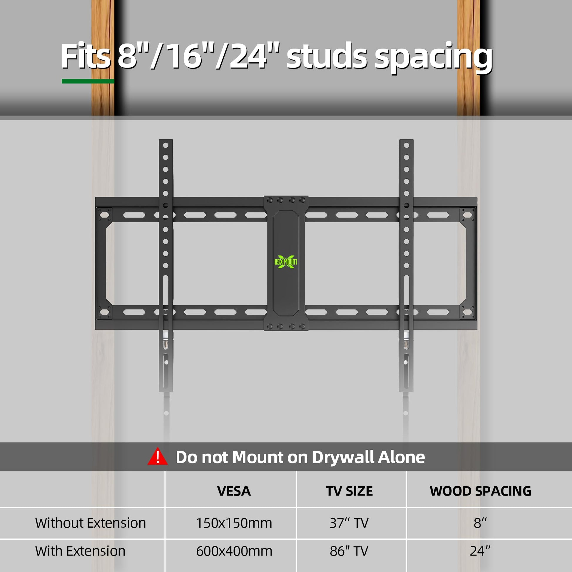USX MOUNT Fixed TV Wall Mount,Low Profile TV Mount for Most 37-86 Inch Flat Screen Televisions,Max VESA 600x400mm Wall Mount Bracket Holds up to 132 lbs,Fits 16"/18"/24" Wood Studs,Quick Release Lock