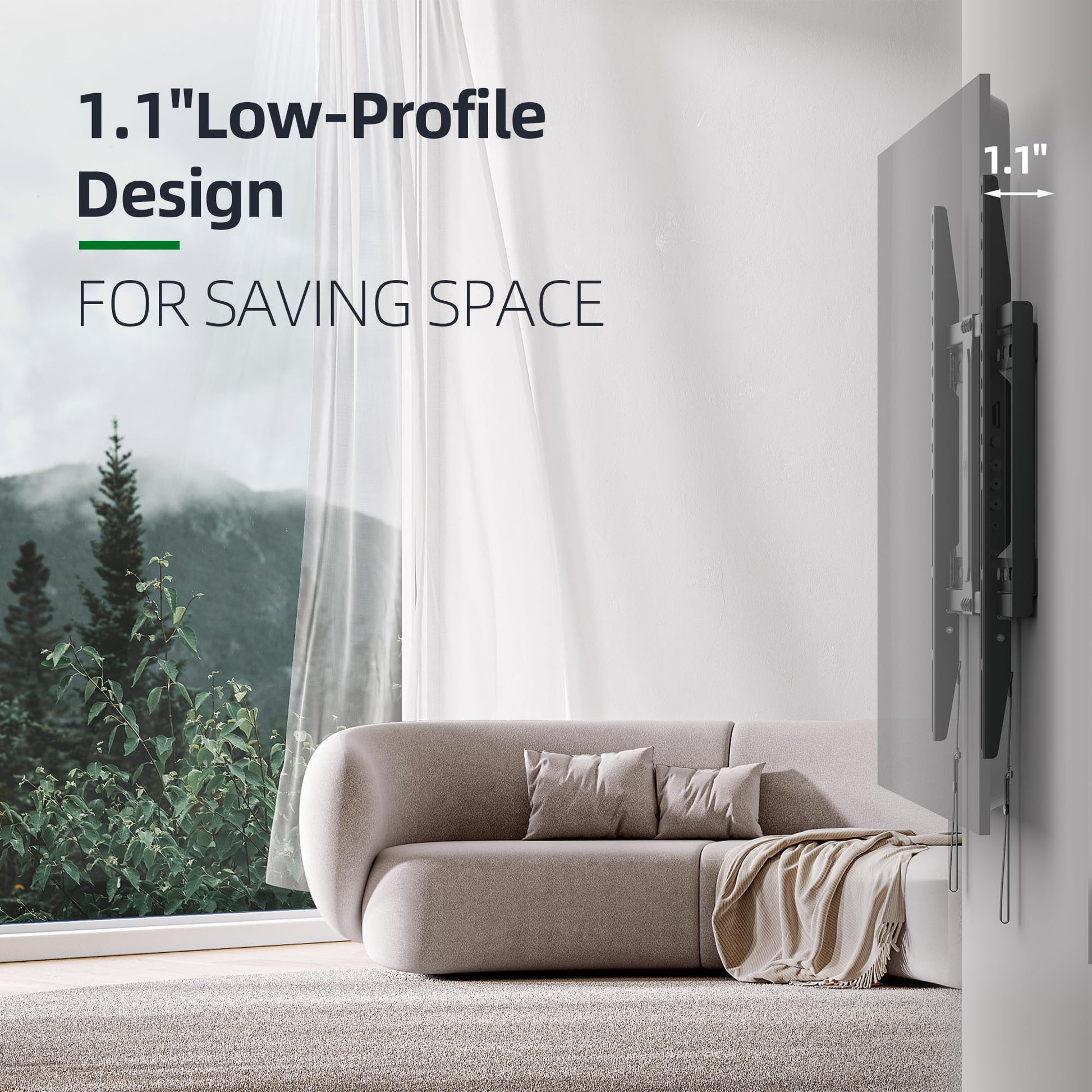 - Space Saving & Low Profile: Only 1.1" away from wall, ultra slim design allows the flush TV mount to blend perfectly into the television without being obtrusive or in the way. Being installed on the wall, it also frees up a lot of spaces on the floor for storage.