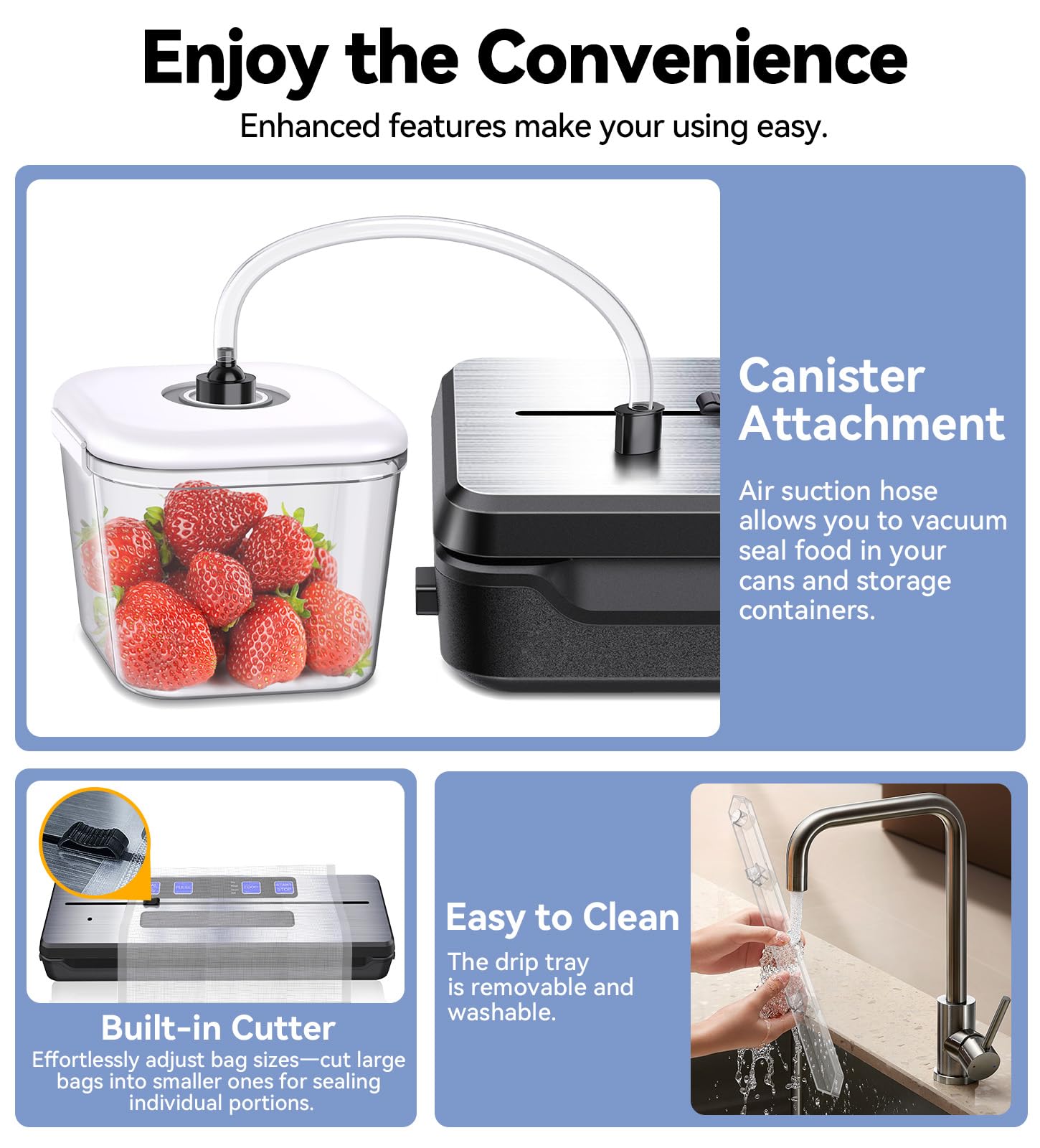 - Convenient Features for Effortless Use: Pulse mode offers manual vacuum control for flexibility, while canister attachment seals food in containers. A built-in cutter lets you customize bag sizes for individual portions. Its compact design saves space, perfect for small kitchens, and the drip tray is removable and washable