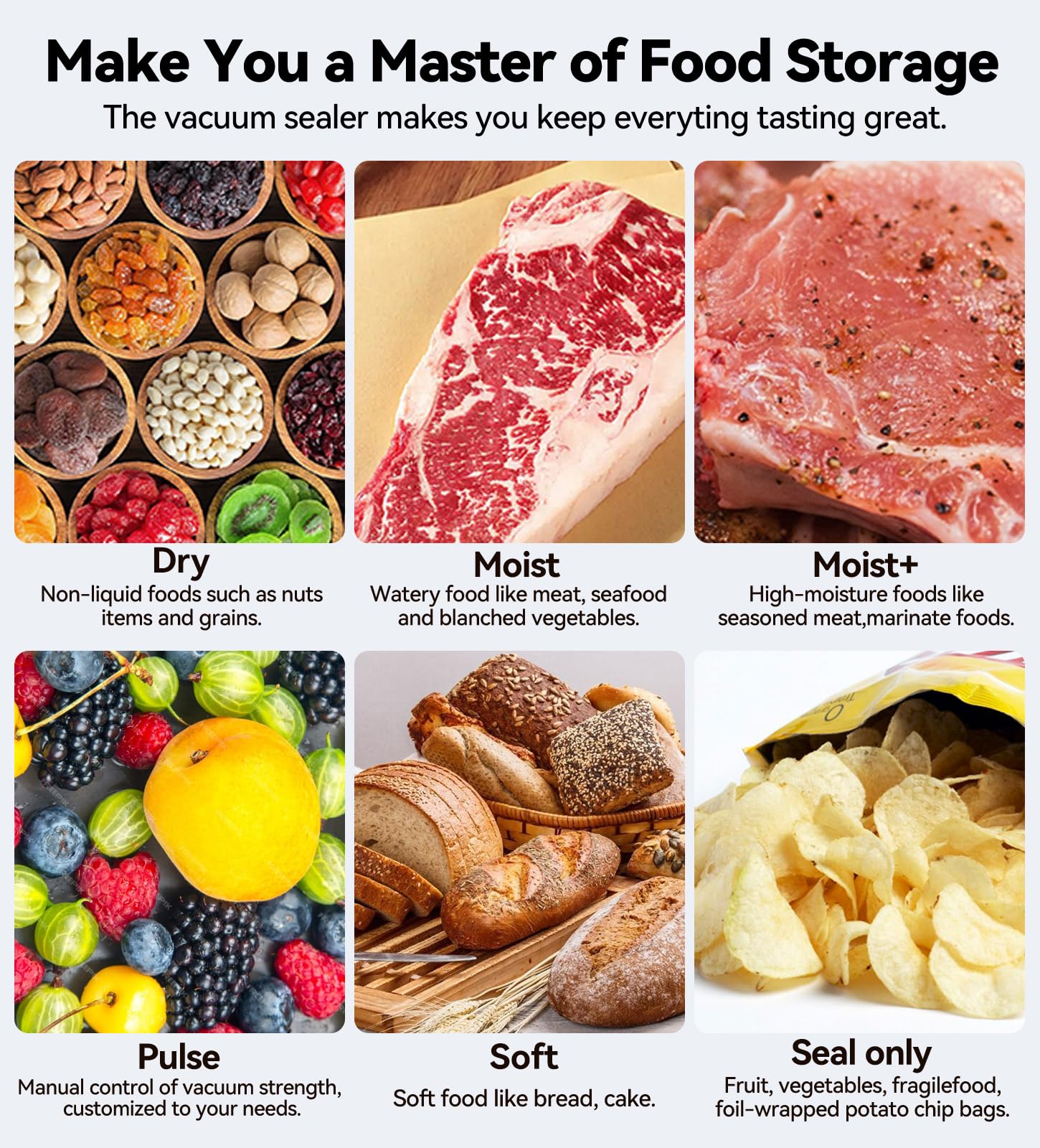 - Quantitative Customization & Save Food:Store large bulk fruits and vegetables in portions for daily maels,and pack kinds of small snacks for kids with Dry, Soft, and Seal Only,keeping your family healthy and reducing waste. A must-have for eco-conscious homes' Storage
